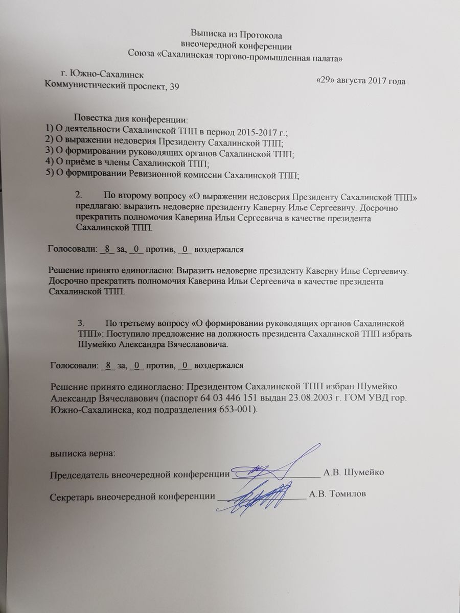 Сегодня, ориентировочно в 10 часов утра, в помещении Сахалинской Торгово-Промышленной Палаты (ТПП) собрался весь ее актив, в том числе и ее действующий президент Илья Каверин.