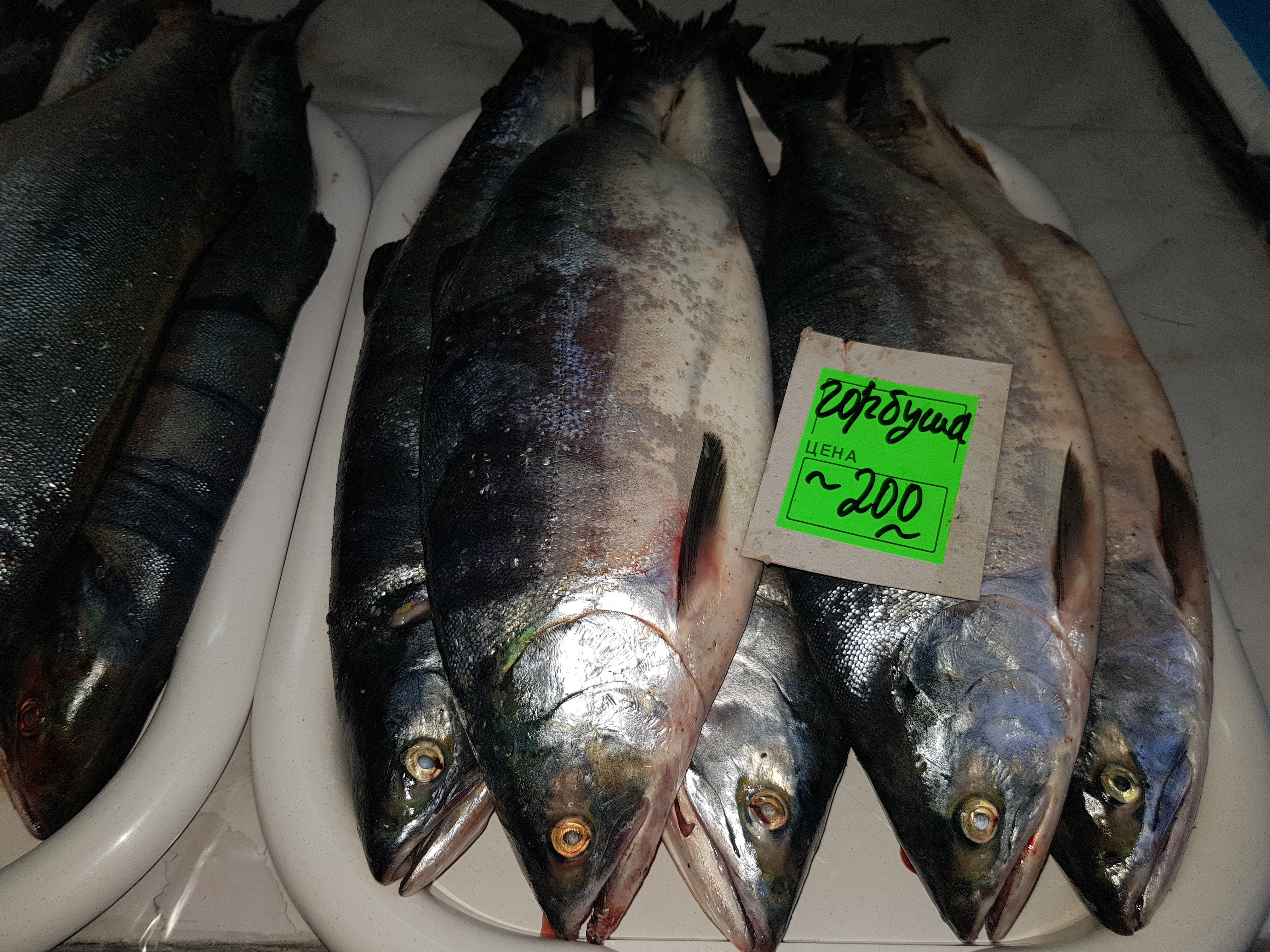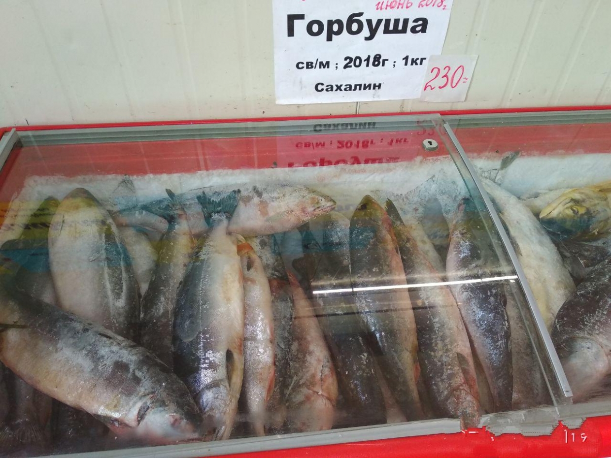 Буквально через дорогу, рынок “Новость”. Там мы обнаружили только один прилавок с горбушей, которая приехала в Южно-Сахалинск вновь “с севера”.
