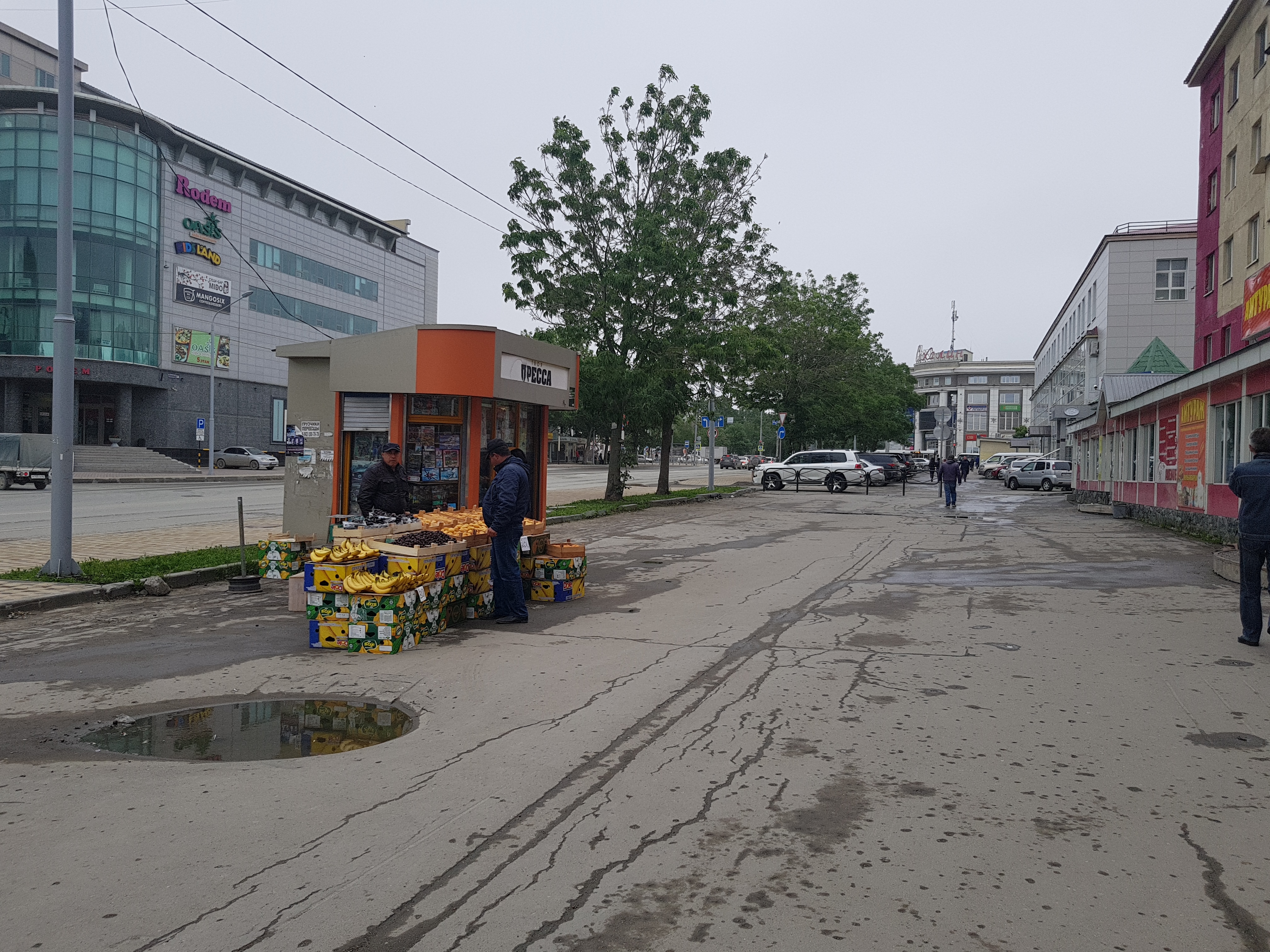 Знаменитая “дорога жизни” (участок улицы Сахалинской), которая была всегда богата на уличных торговцев, теперь девственно пуста. Лишь газетный ларек и бананы разбавляют серый (не осенний) пейзаж.