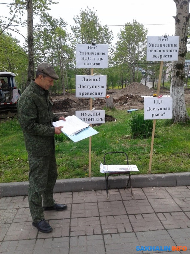 Макаровчанин Сергей Мустяца второй день проводит пикет и сбор подписей против повышения пенсионного возраста и налога на добавленную стоимость, а также за доступную рыбу, древесину и ежегодные публичные отчеты чиновников и депутатов. Активисту, который разработал целый бланк-опросник, уже удалось собрать около 200 подписей жителей района. Публичная акция проходит в центре города, в сквере имени адмирала Макарова, и продлится до тех пор, пока не будет собрано как минимум 350 подписей.