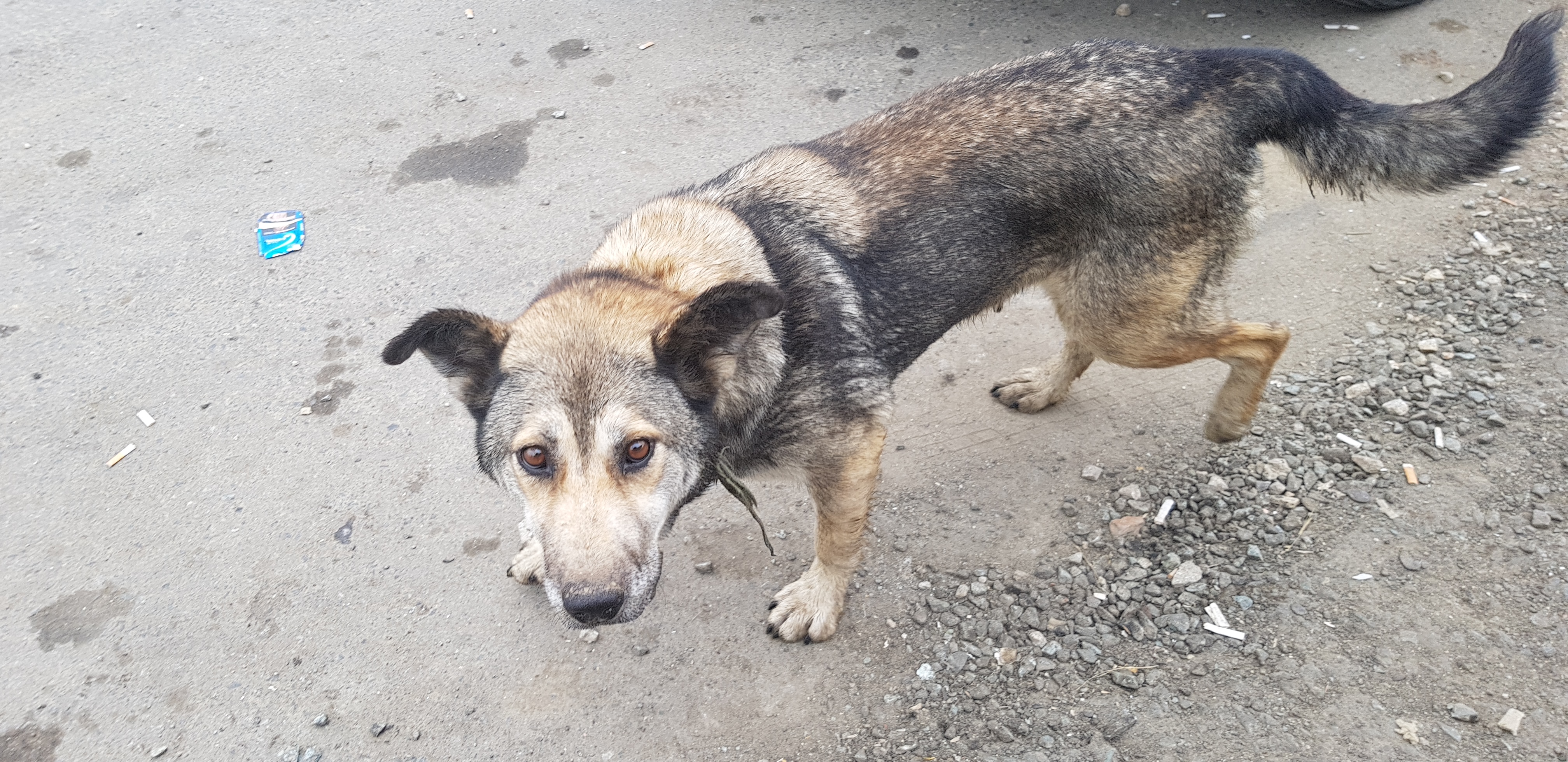 Вокруг вьется стайка собак, которые привыкли здесь получать подачки из рук автомобилистов.