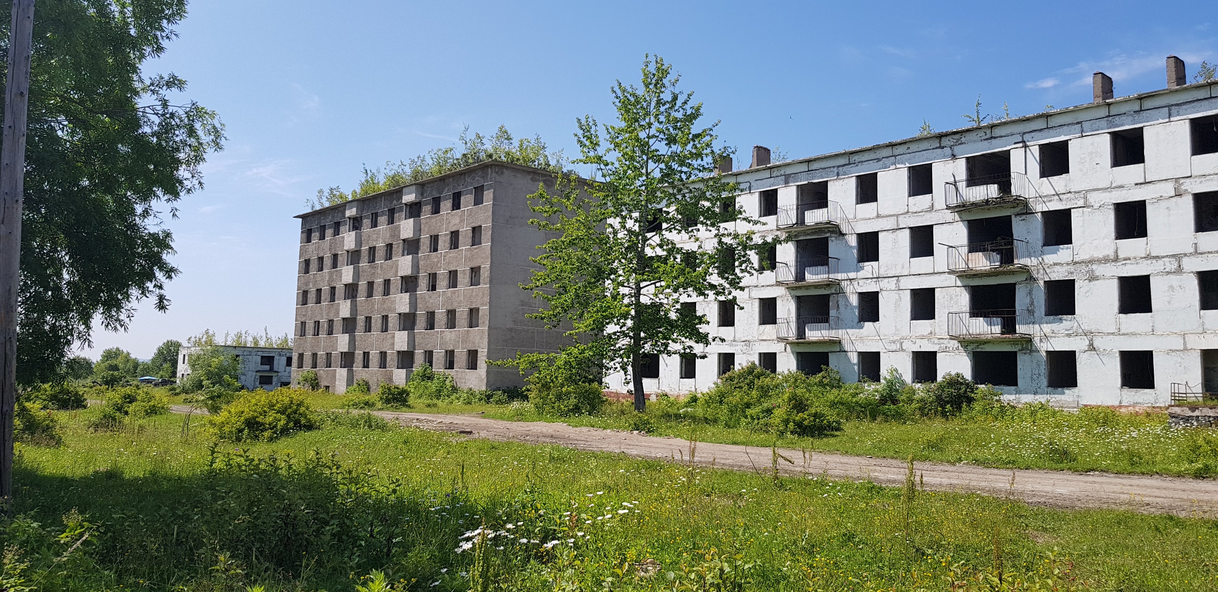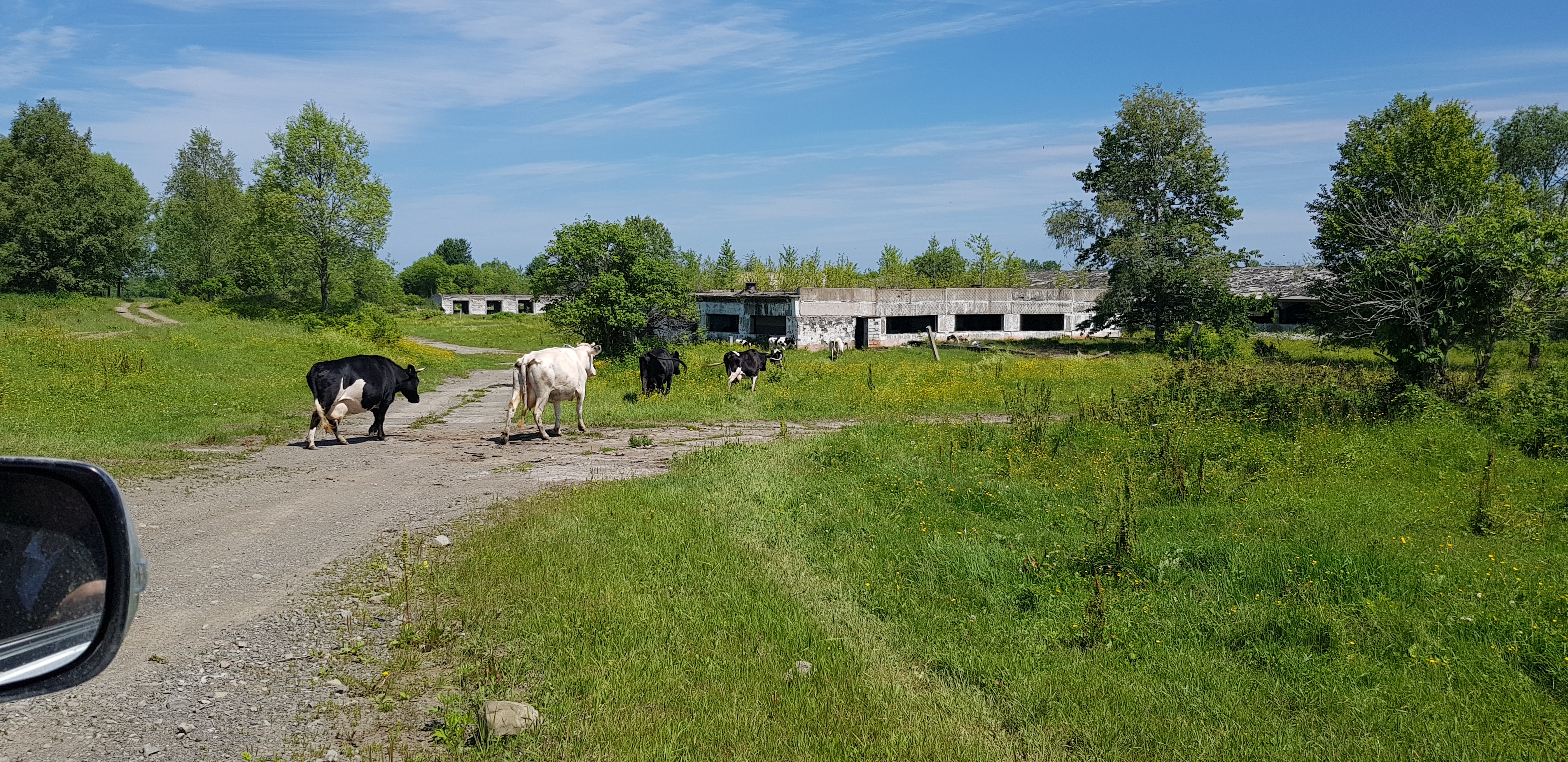 Цель нашей поездки – село Забайкалец. Заехав в округу села, мы двинулись по грунтовой дороге, которая оказалась еще жива и была проложена вдоль существующих животноводческих комплексов, существующих сейчас в виде разрушенных зданий и вдоль заросших молодыми деревьями полей и пастбищ.