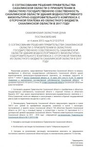 Сахалинская областная Дума принимает решение о финансировании тех или иных программ областного правительства. Принципиальная и важнейшая роль законодательного органа слегка поистрепалась со временем, и эта функция второй ветви власти трансформировалась в ставшую привычную практику одобрения предложений первой ветви – исполнительной. Баланс оказался слегка нарушен. Однако, в 2013 году появилось на свет Постановление, в котором недвусмысленно сказано: “…согласовать приобретение с отсрочкой платежа из областного бюджета в 2017 году (???) после его введения в эксплуатацию и постановку объекта на учет в ЕГРП”. Вторым пунктом законодатели рекомендуют предусмотреть более 3 млрд 400 млн рублей на оплату этой сделки из средств областного бюджета.