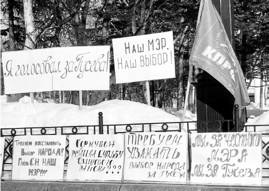 «Требуем восстановить выбор народа!», «Гусев наш мэр!», «Мы за честного мэра, мы за Гусева!», «Чужого не надо, своего не отдадим!», «Нам не безразлична судьба Охи! Охинскую ТИК — в отставку!» — такие лозунги можно увидеть на транспарантах протестующих.