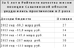 В 2016 году Сахалин по качеству жизни оказался позади не только всех нефте- и газодобывающих регионов России, но и таких небогатых областей, как Ивановская, Белгородская, Самарская, Рязанская.
