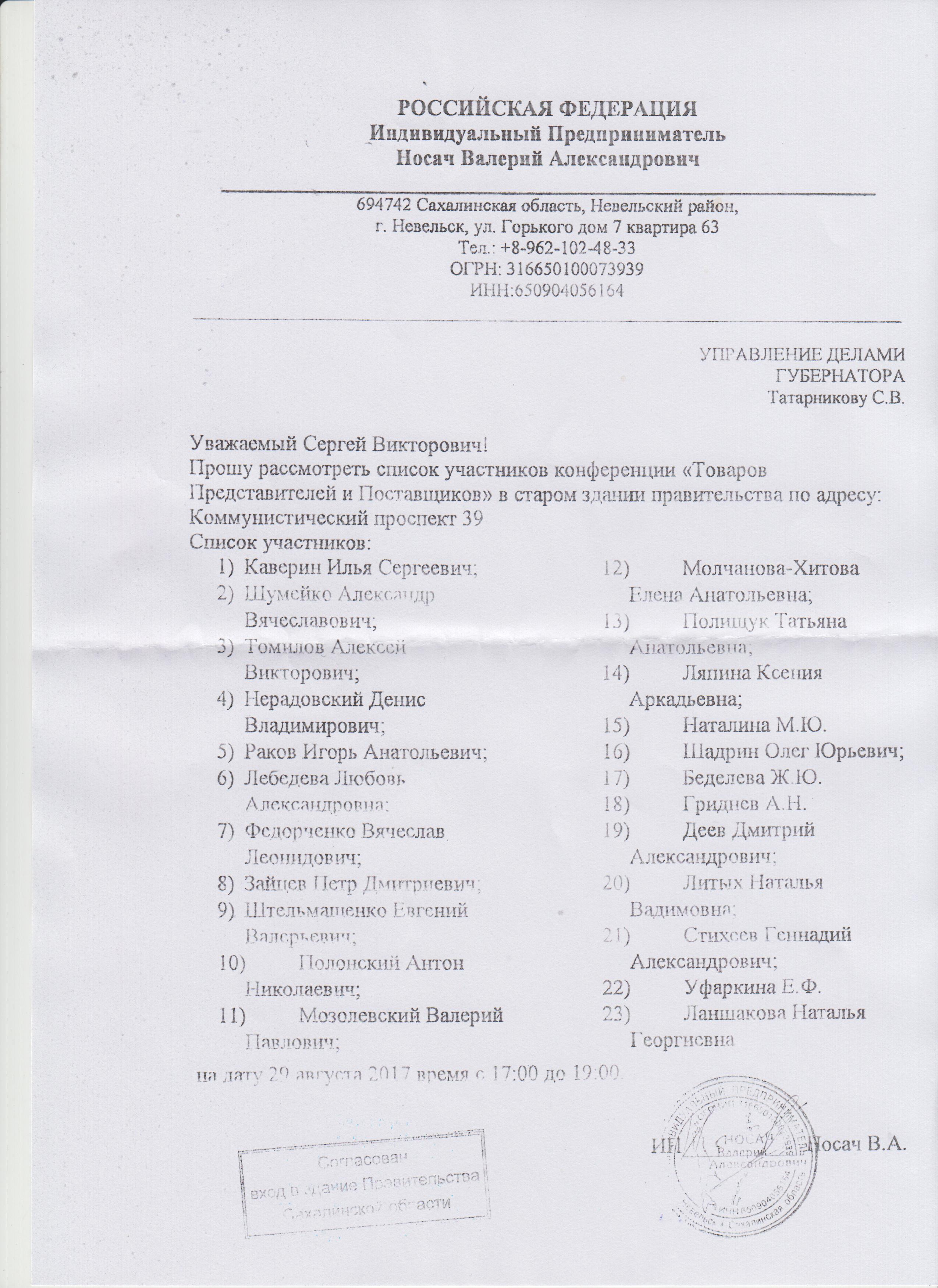 В пресс-службу СРОПП КПРФ поступил документ, адресованный в Управление Делами Губернатора Татарникову С.В.