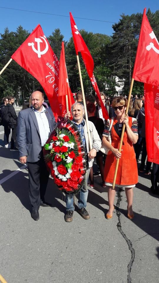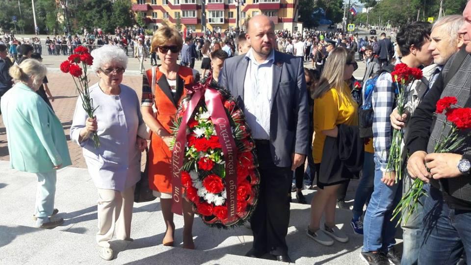 Член ЦК КПРФ, второй секретарь Приморского крайкома КПРФ Павел Ашихмин, депутат Сахалинской областной Думы Галина Подойникова, руководитель общественной приемной Г.А.Зюганова в Южно-Сахалинске Жанна Матвеева возложили памятный венок к Вечному огню у монумента в честь павших воинов.