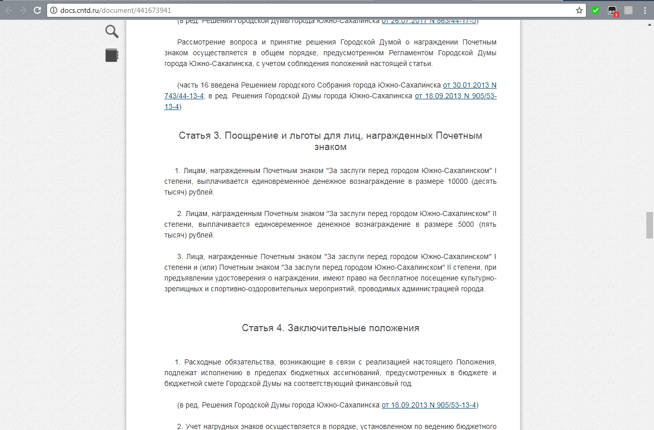 На сайте Южно-Сахалинской городской Думы опубликовано сообщение о присуждении Звания «Почетный гражданин города Южно-Сахалинска» награждении жителей областного центра и награждении Почетным знаком «За заслуги перед городом Южно-Сахалинском».