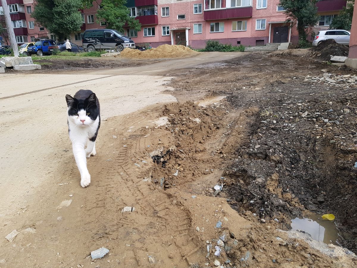 Летом текущего года, дворы по улице Горького и проспекта Победы (прилегающие к площади) подверглись капитальному ремонту. Подрядчик шел методично, вскрывая один двор за другим. Крайним в этом ряду оказался двадцатый дом, которому сильно не повезло. На его ремонт не осталось денег. Успели убрать старый асфальт, демонтировать отмостку дома и…на этом остановились.