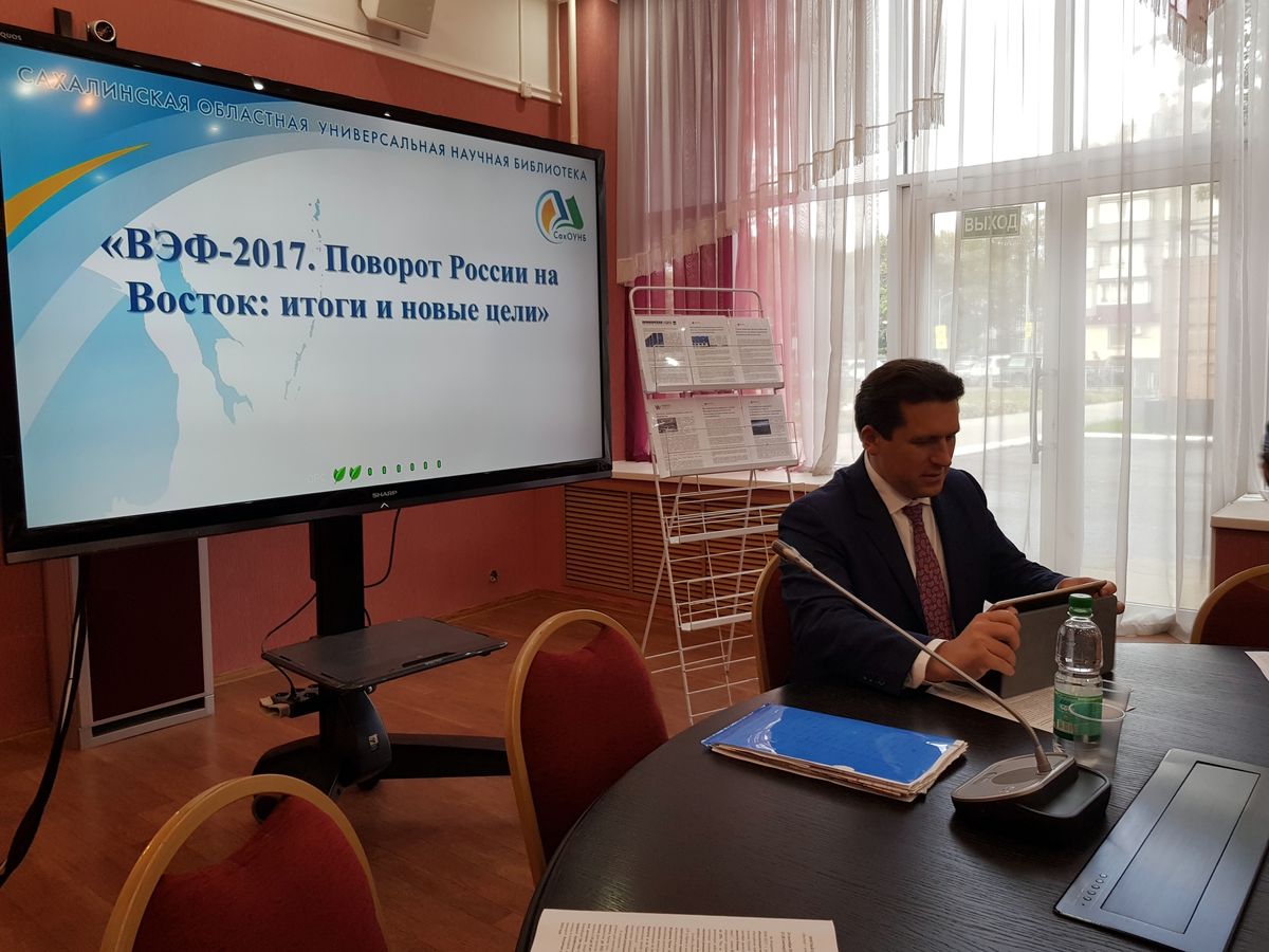 Накануне, в малом зале Сахалинской областной библиотеки, состоялось заседание круглого стола. Тема мероприятия звучала так: КРУГЛЫЙ СТОЛ – «ВЭФ-2017. Поворот России на Восток: итоги и новые цели».