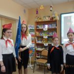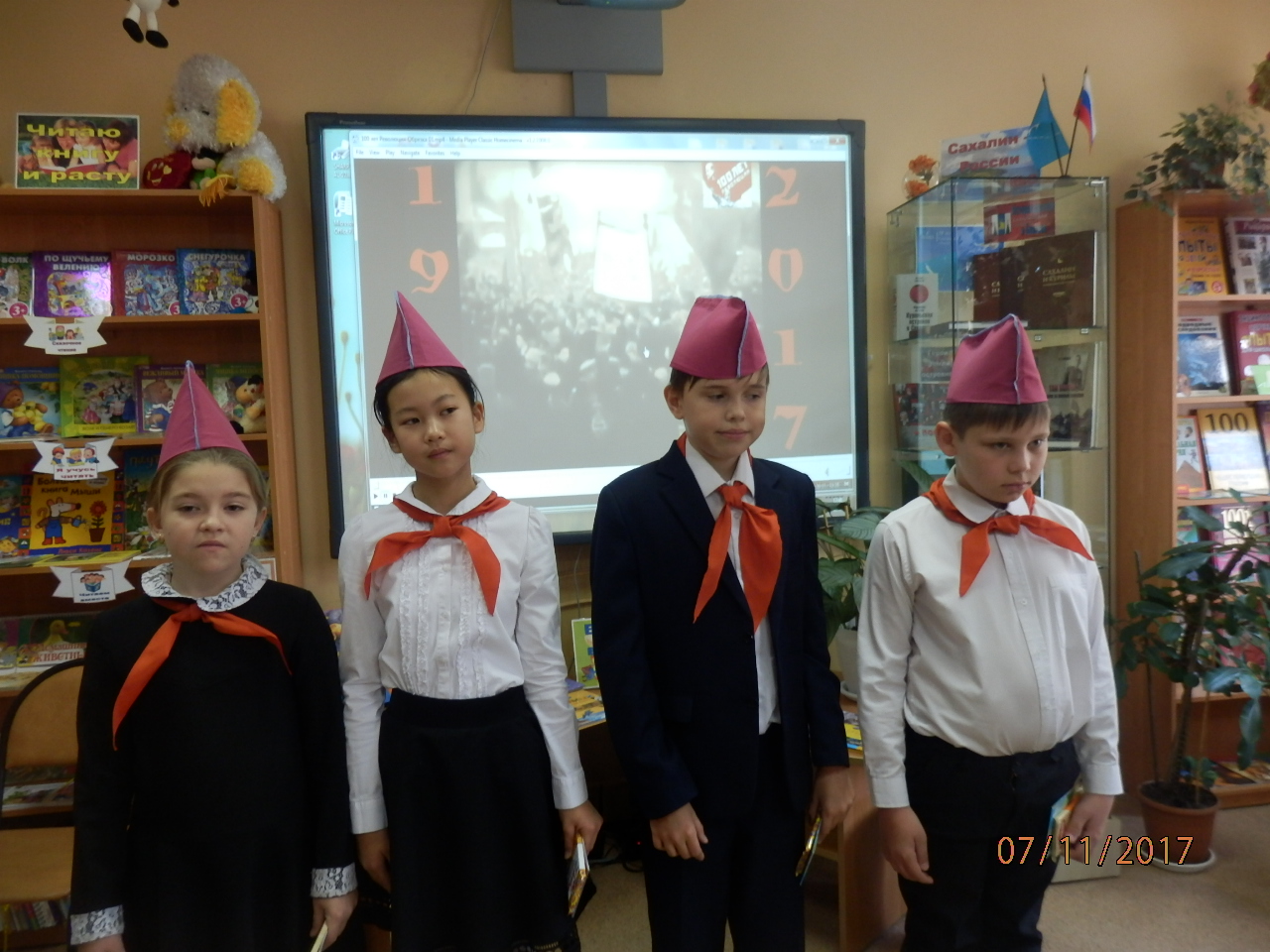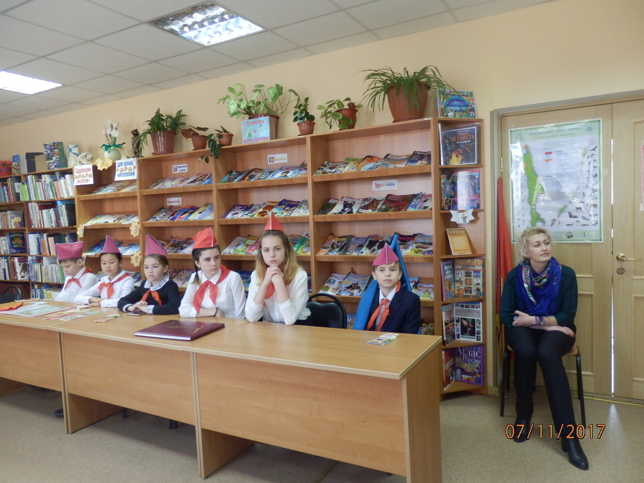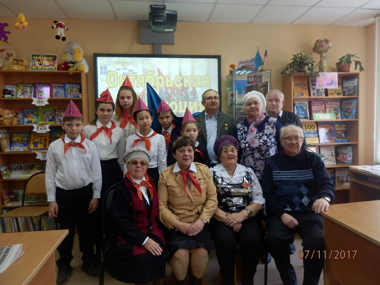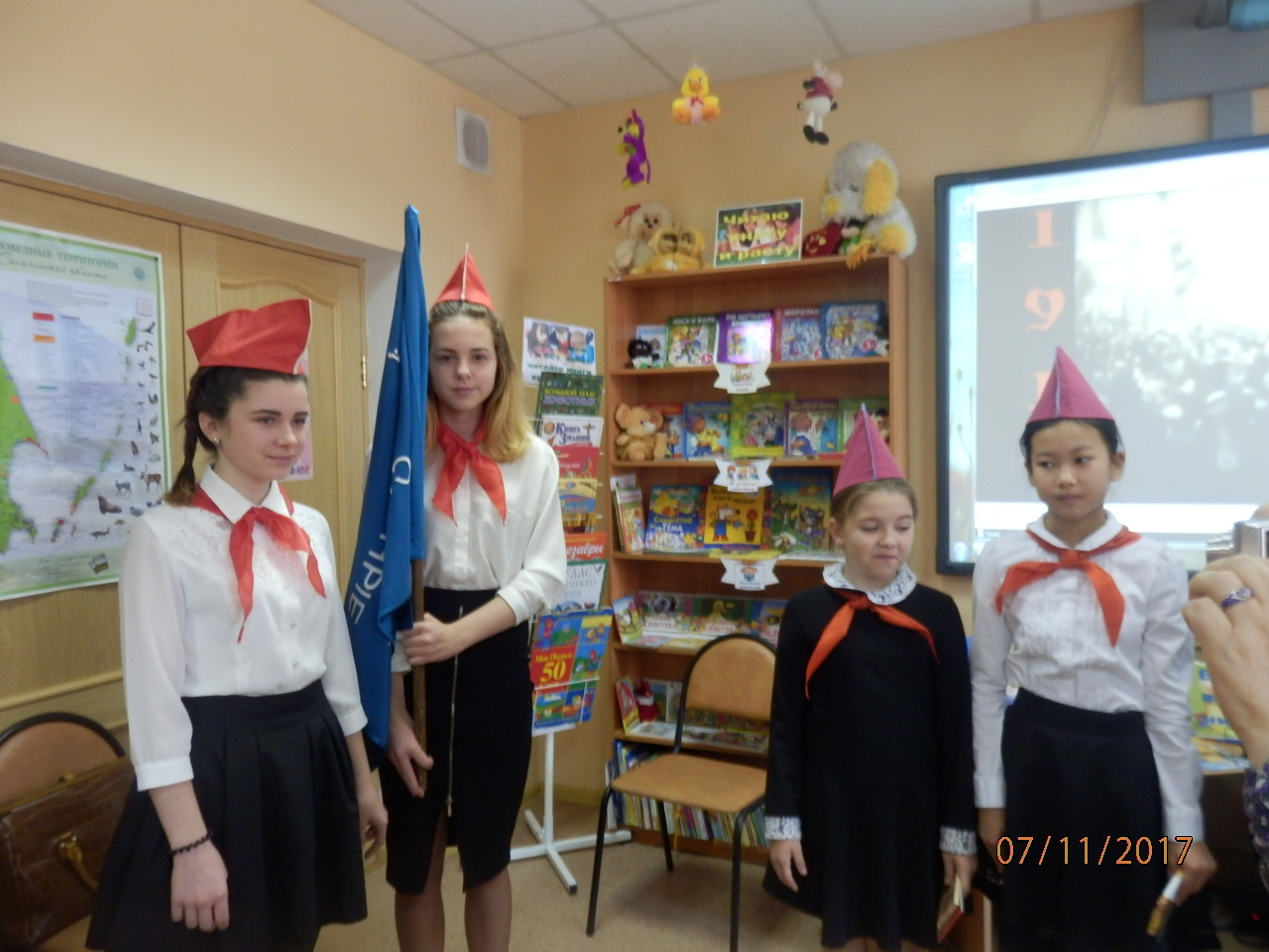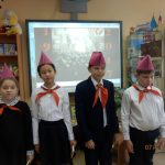 7 ноября торжественные мероприятия в районе продолжились. В детской библиотеке заслуженные коммунисты повязали пионерские галстуки членам детской коммунистической организации.