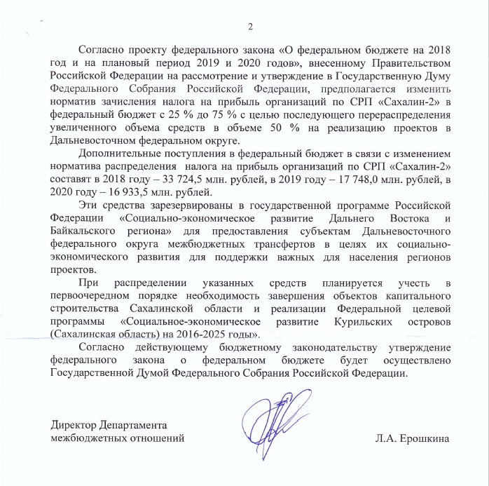 «Правительство РФ приняло решение о возврате в бюджет Сахалина не менее половины от перераспределяемых в доходы федерального бюджета средств, общая сумма которых составит в 2018 году более 33 млрд рублей. Об этом заявил глава комитета Госдумы по бюджету и налогам Андрей Макаров в ходе обсуждения поправок в Бюджетный кодекс…»