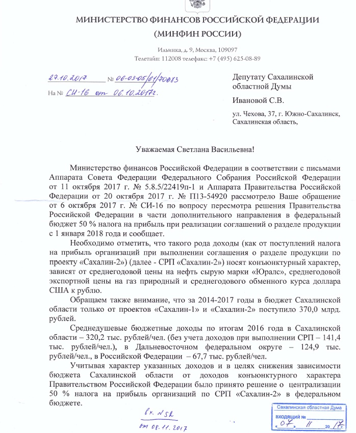 Предлагаем оперировать не информацией СМИ, а документами. Депутат Сахалинской областной думы от КПРФ Светлана Иванова сделала запрос в генеральную Прокуратуру России и та перенаправила его в недра Министерства финансов. Чиновники, в своем ответе, говорят о том, что экономика Сахалинской области, в период с 2014 по 2017 годы, благополучно поглотила 370 млрд рублей полученных в рамках СРП.