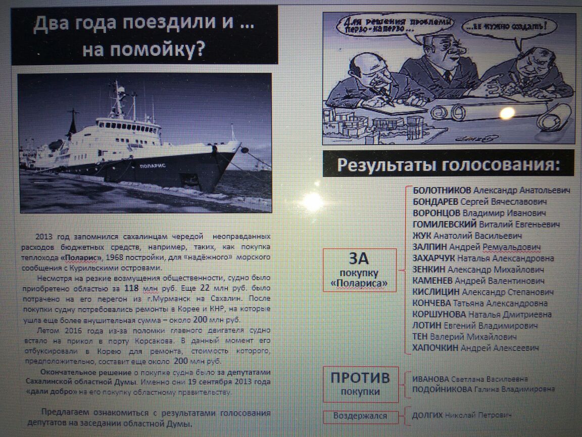 Судно теперь готовится в утиль, на него уже истрачено более 600 млн рублей (содержание и ремонт) – бюджет социально ориентированный. И ориентировать его в эту сторону помогал Андрей Хапочкин, голосуя «ЗА» покупку. Ответственности за пустую растрату денег бюджета не понес, как и не несет ее до сих пор по другим вопросам.