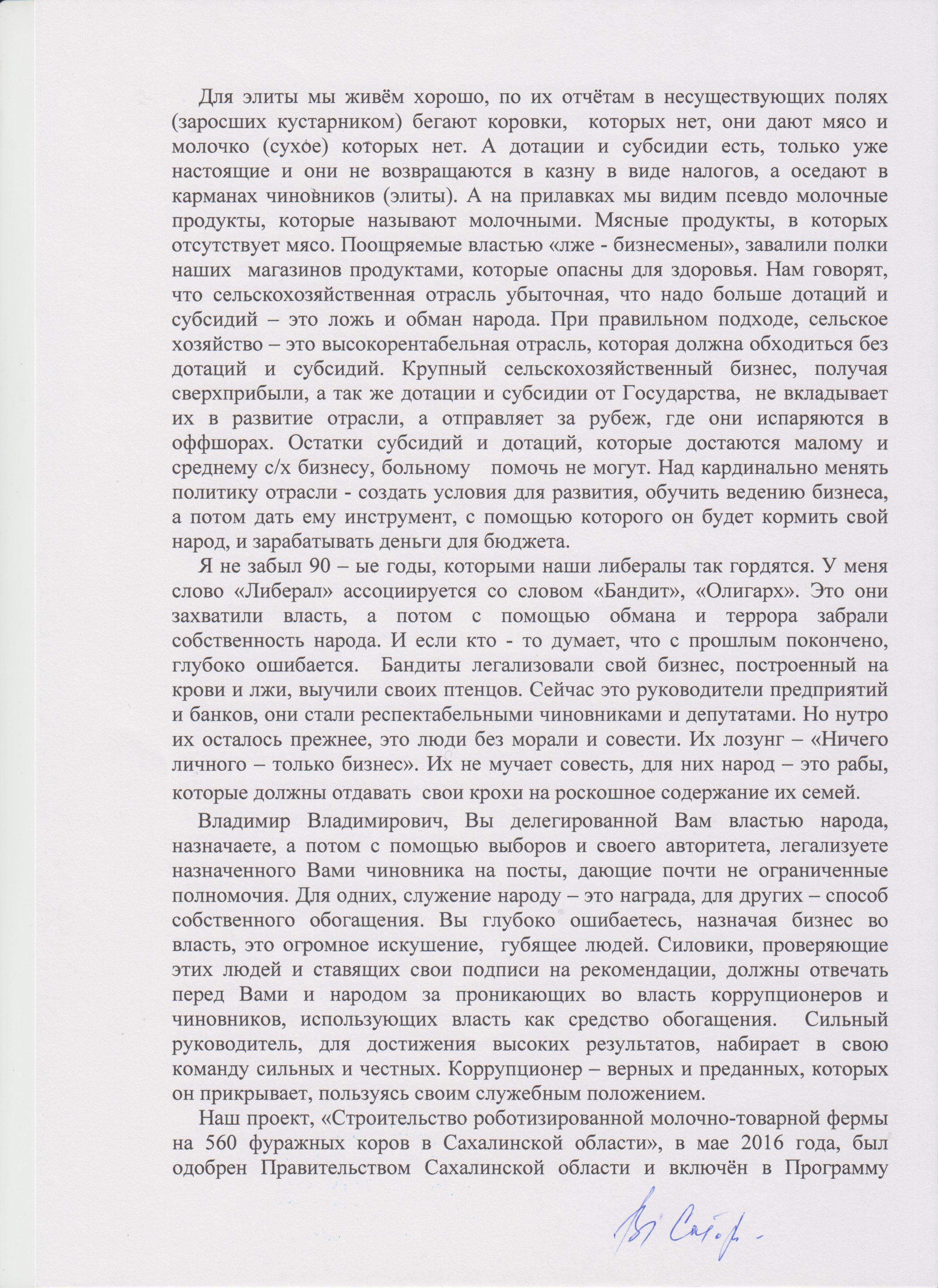 «В апреле 2016 года, ООО «Нечерноземье» представило Губернатору Сахалинской области Олегу Кожемяко проект: «Строительство роботизированной молочно-товарной фермы на 560 фуражных коров. По приглашению этого губернатора мы прибыли в Южно-Сахалинск, где по указанию Кожемяко было проведено совещание, с первым заместителем Министра сельского хозяйства Тамары Муленковой. Нами был представлен проект «Строительство инновационной, роботизированной молочно-товарной фермы на 560 фуражных коров». Проект был встречен положительно. После совместного доклада (ООО «Нечерноземье» и Первого заместителя министра сельского хозяйства Муленковой)