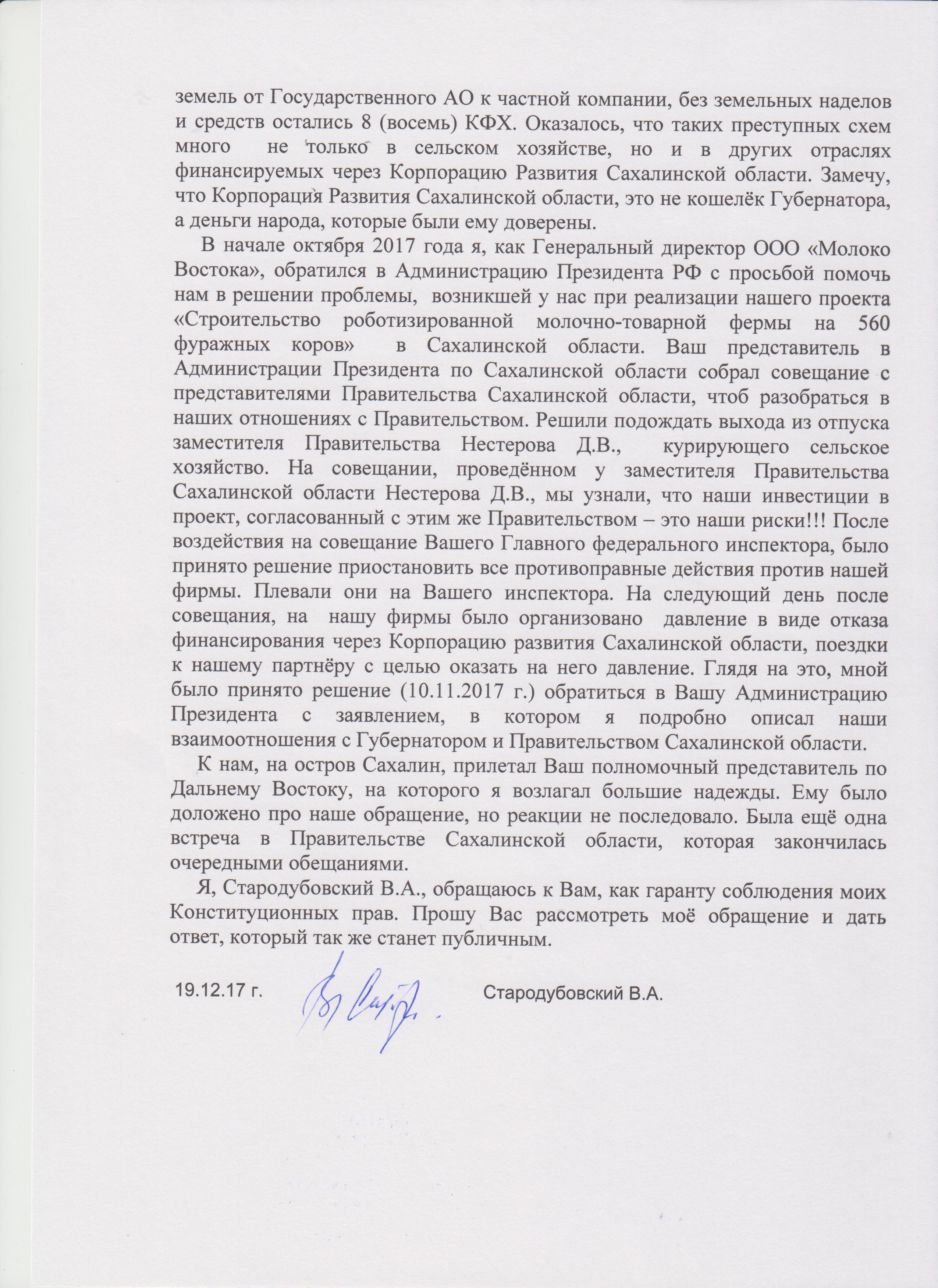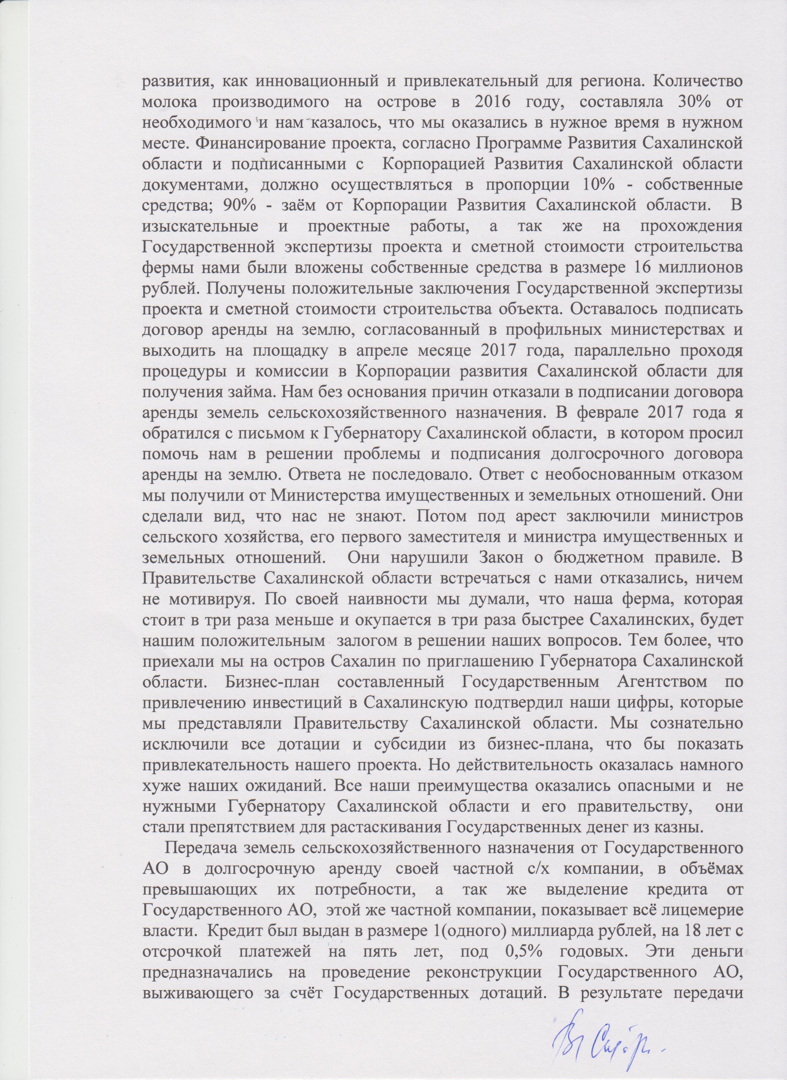 «На все наши последующие обращения в Правительство Сахалинской области и лично к Заместителю Председателя правительства Сахалинской области Дмитрию Нестерову остались без ответа. Без нашего согласия и уведомления, в мае 2017 года, Губернатор Сахалинской области дает поручение о передаче имущественного комплекса (вместе с землёй) АО «Тимирязевское» в собственность АО «Совхоз Южно-Сахалинский».