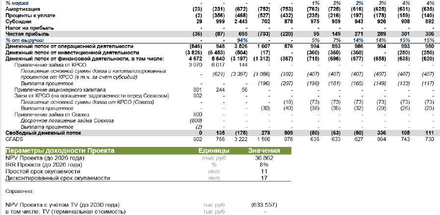 На самом деле нам интересен этот проект на Дальнем Востоке, он мог бы позволить кардинально изменить ситуацию со стоимостью скотоместа и себестоимостью молочной продукции в регионе. По данным Бизнес-плана, разработанного Агентством по привлечению инвестиций в Сахалинскую область, окупаемость проекта, без субсидий и дотаций, составляет: