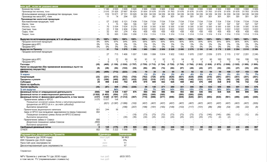 Судя по представленной «Корпорацией» финансовой модели проекта «»Строительство двух животноводческих комплексов на 3 800 голов дойного стада» резидента ТОР «Южная» «Грин Агро Сахалин», уже начато финансирование из средств Корпорации (более 10 млрд рублей) сроком на 17 лет под 0.5% годовых с отсрочкой платежей на 5 лет. И его срок окупаемости составляет 17 лет.