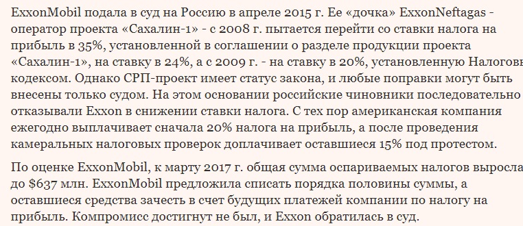 Похоже, документ (Соглашение СРП-1) со статусом федерального закона уже претерпел определенные изменения (Правительство – Exxon Neftegas Limited ), суд в Стокгольме закончил свою работу и между сторонами достигнуты определенные соглашения, в результате которых объемы налоговых выплат в бюджеты различного уровня будут пересмотрены. Сумму, которую “простили” оператору проекта, чиновники не разглашают.