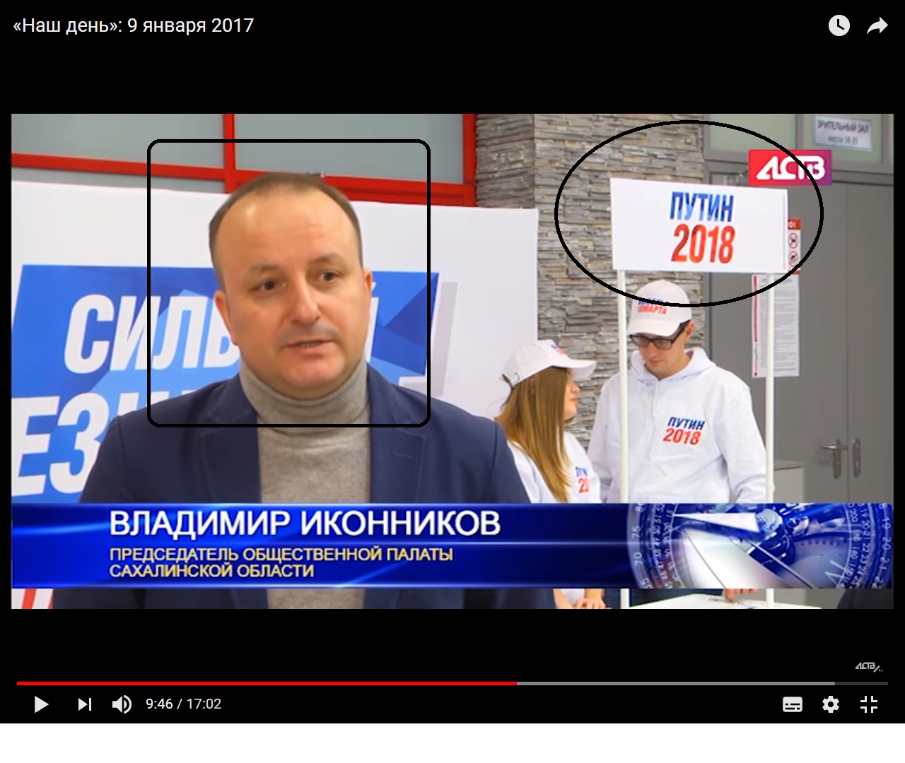 председатель Общественной палаты Сахалинской области, который находится на фоне баннера с надписью “Владимир Путин”. По сути, подобное сочетание представителя всей общественности области и упоминание одного вероятного кандидата, которое охватывает существенную часть телесюжета, напоминает скрытую предвыборную агитацию.