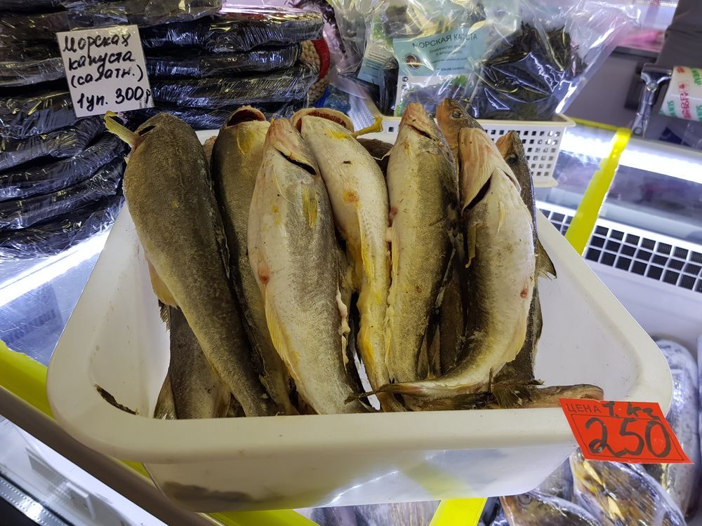 Под стенами красочного здания идет вялая торговля навагой. Забегая вперед, мы уже потом поняли, почему она вялая, причем во всех точках. Цена на улице – 170 рублей за килограмм рыбы, замороженной способом «ворошение».