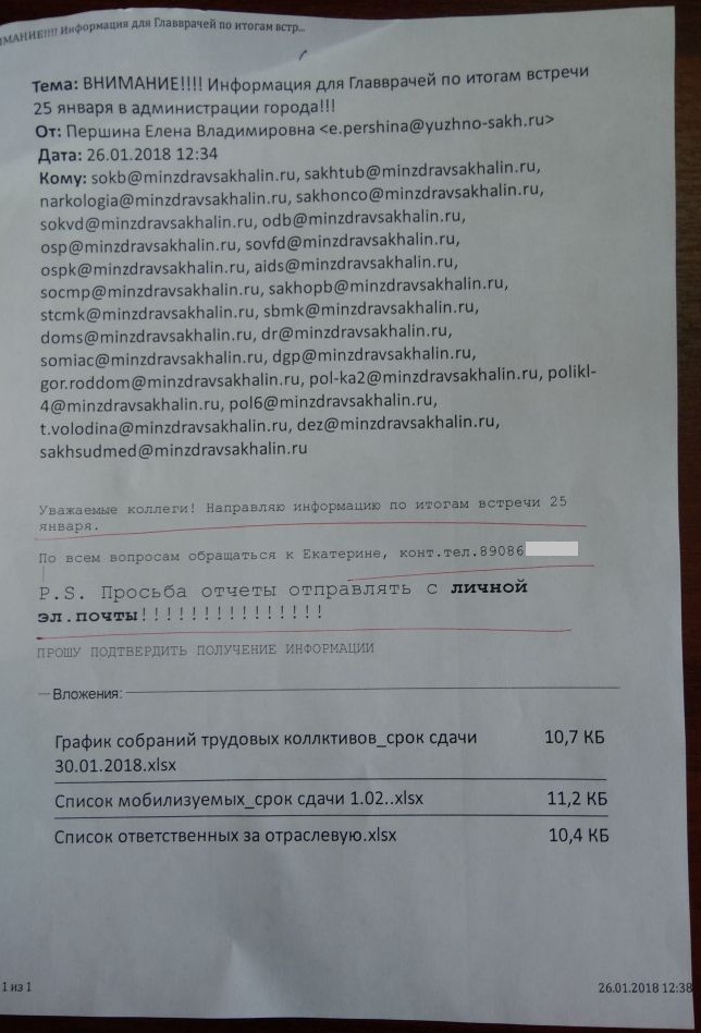 В распоряжении Сахалинского регионального отделения КПРФ оказались документы переписки между главными врачами лечебных учреждений Сахалинской области и некой Еленой Першиной. В них Першина (главный специалист 1 разряда – по сведениям официального сайта администрации города Южно-Сахалинска) требует от руководителей предоставить некой Екатерине персональные данные избирателей, список этих “мобилизуемых” и графики проведения собраний трудовых коллективов.