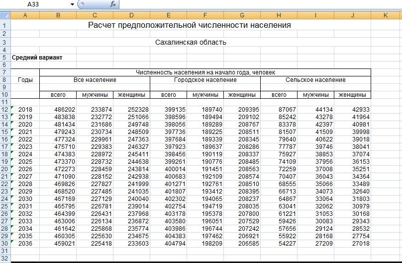 Органы статистики Сахалинской области публикуют прогноз численности населения на следующие 18 лет. В приведенной таблице рассматривается численность населения по годам, в том числе количество мужчин и женщин, проживающих в городе и на территории сельских поселений.