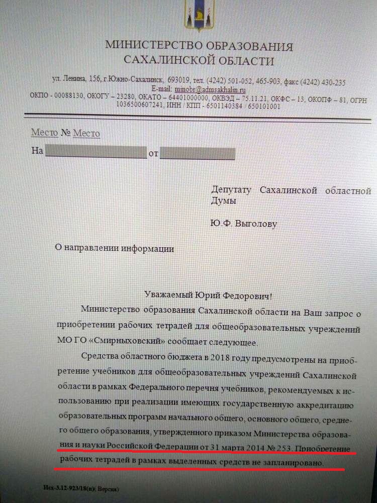 В адрес председателем фракции КПРФ в Сахалинской областной Думе Юрия Выголова было получено обращение жителей Смирныховского района. В нем они просят депутата повлиять на сложившуюся ситуацию и снять бремя расходов по приобретению учебного материала с плеч родителей. В ответе Министерства образования сказано определенно – бюджетом Сахалинской области подобные расходы не предусмотрены.