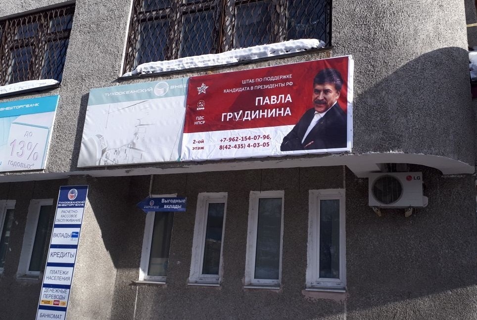 Штаб по поддержке кандидата в Президенты Российской Федерации Павла Грудинина осуществляет свою работу в городе Корсаков по адресу: улица Советская, 24 (ТЦ “Гермес”).