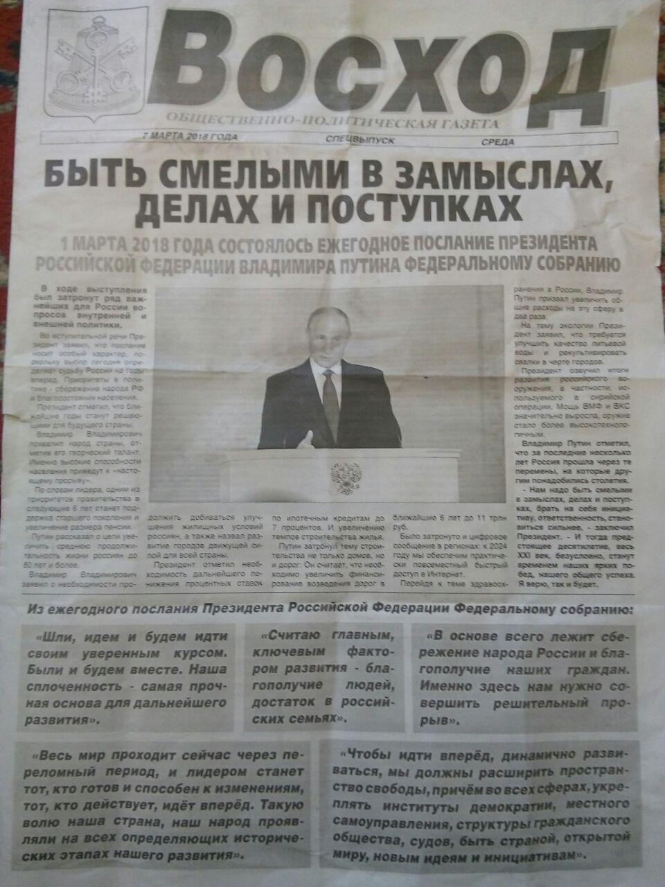 Материал о деятельности одного из кандидатов в президенты России размещен на страницах районной газеты “Восход”. Информации об оплате этого материала из средств избирательного фонда Владимира Путина нам отыскать не удалось.