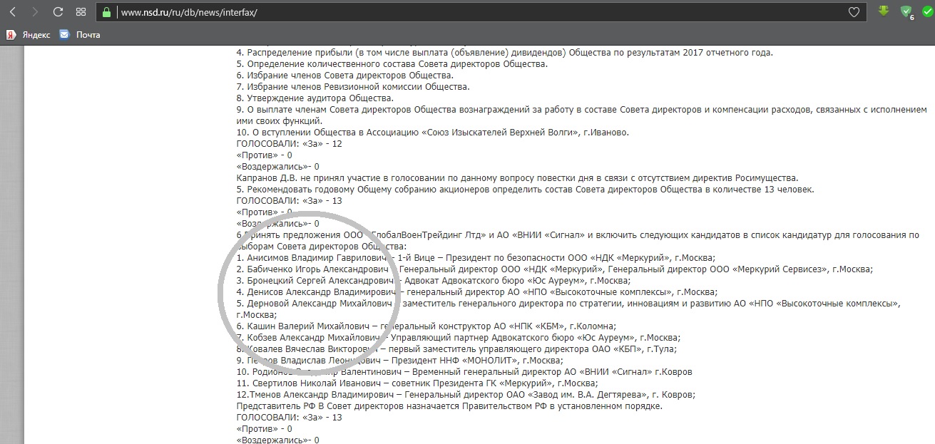 - 16 февраля 2018 года открытое акционерное общество “Завод им. В.А. Дегтярева” решением совета директоров включает Дернового Александра Михайловича (заместителя генерального директора по стратегии, инновациям и развитию АО «НПО «Высокоточные комплексы», г.Москва) в список кандидатур для голосования по выборам Совета директоров Общества.