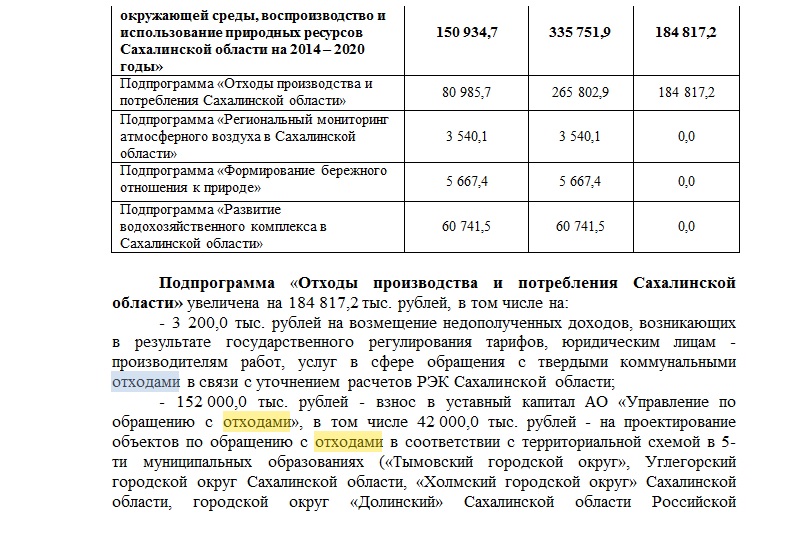 По подпрограмме «Отходы производства и потребления Сахалинской области» предусматривают 152 миллиона в качестве взноса в уставный капитал АО «Управление по обращению с отходами», в том числе 42 миллиона – на проектирование объектов в 5-ти муниципальных образованиях, и 110 миллионов – на строительство мусоросортировочного пункта в Южно-Сахалинске.