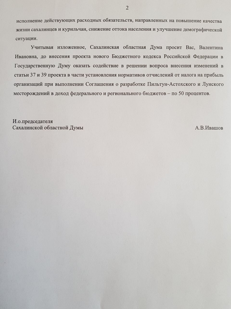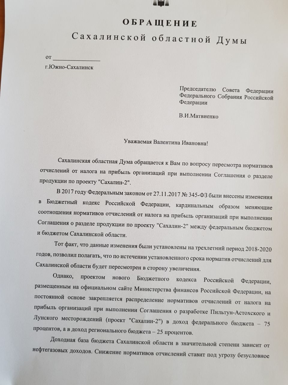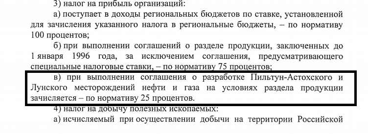 Более того (цитата) – «Члены постоянного комитета по бюджету и налогам Сахалинской областной Думы 15 мая приняли проект обращения к председателю Совета Федерации РФ Валентине Матвиенко. В нем идет речь о скандально известном пересмотре норматива отчислений налога на прибыль от проекта «Сахалин-2» по Соглашению о разделе продукции.»