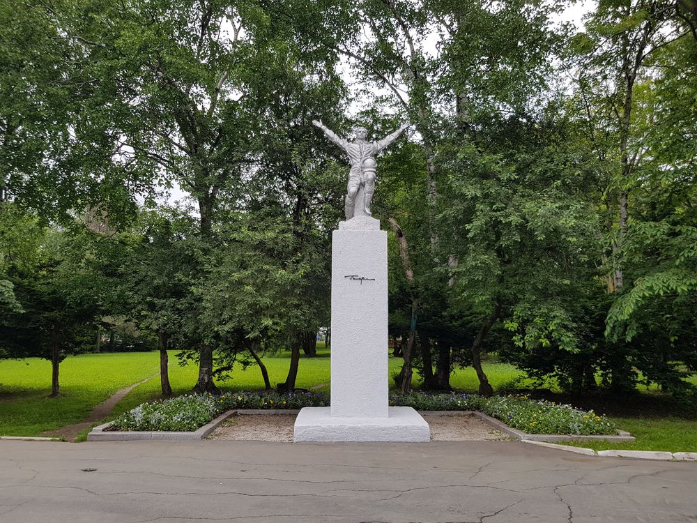 Входим в парк с центрального входа. Фигура Юрия Гагарина по прежнему на своем месте и приветствует нас. Прошлись по аллеям,