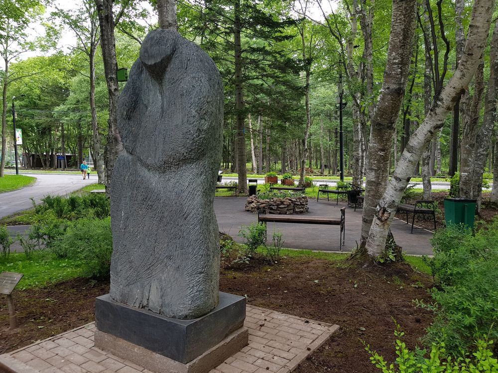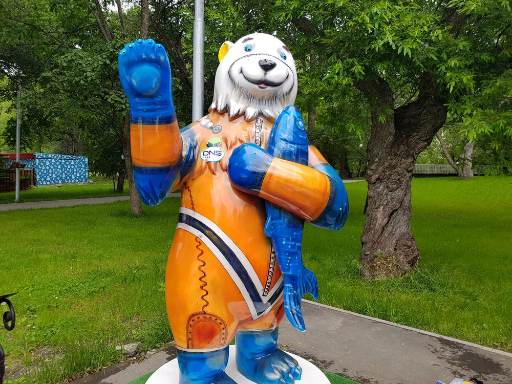 Единственно, что мы смогли отыскать на территории парка – выставочный медведь, которому загодя вручили рыбу, застраховав его от поиска пищи.
