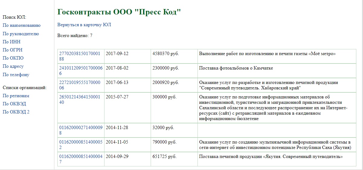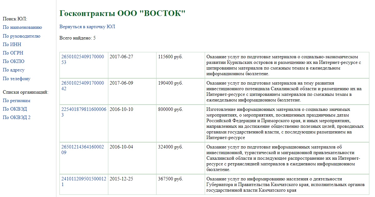 В перечне государственных контрактов значится “Оказание услуг по подготовке информационных материалов об инвестиционной, туристической и миграционной привлекательности Сахалинской области и последующее распространение их на Интернет-ресурсах (сайт) с ретрансляцией материалов в ежедневном информационном бюллетене”.