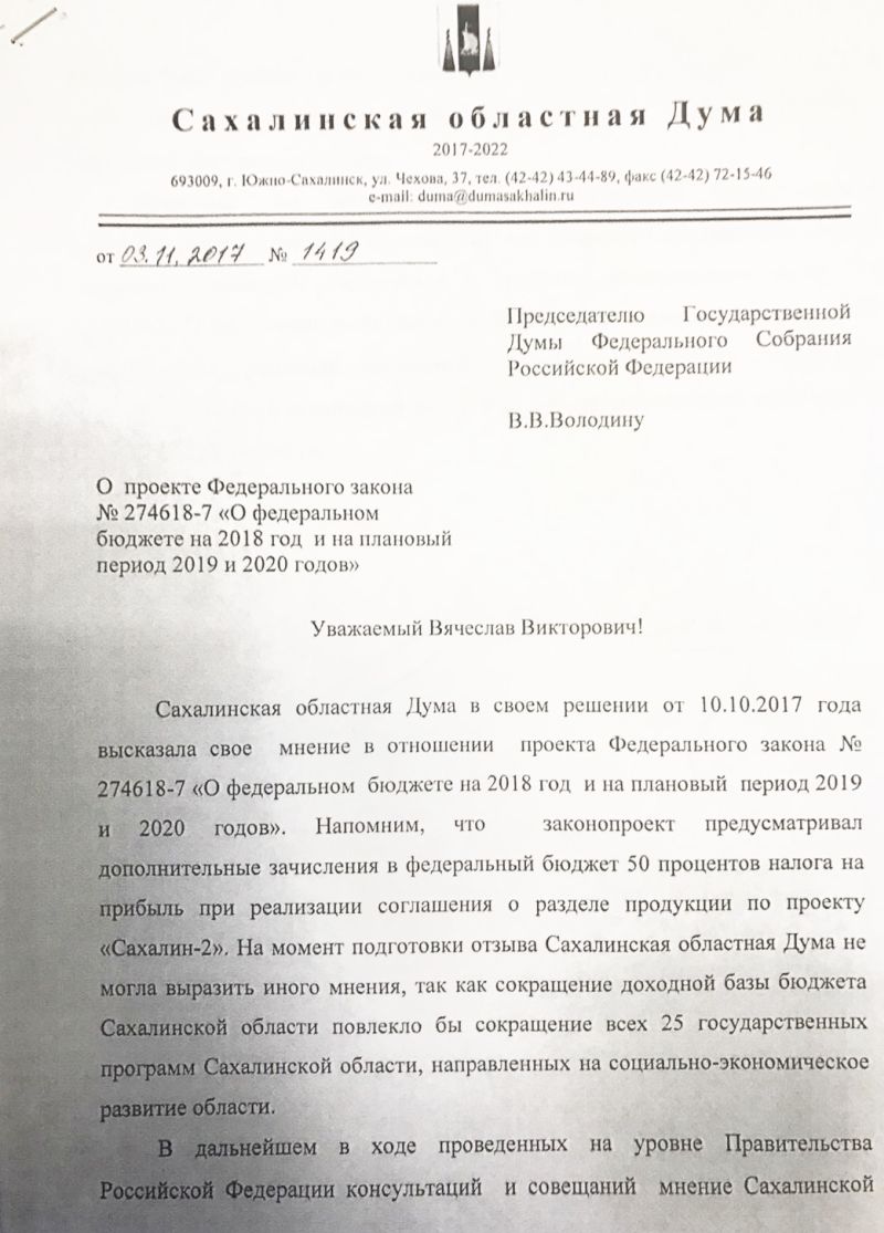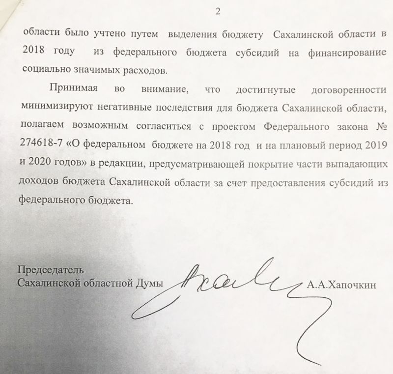А теперь мы напомним, чем размахивал Макаров, убеждая в покладистости сахалинцев. Он оперировал текстом, который единолично подписал председатель Сахалинской областной Думы, названным позже «письмом Хапочкина», глубокой ночью и в спешном порядке.