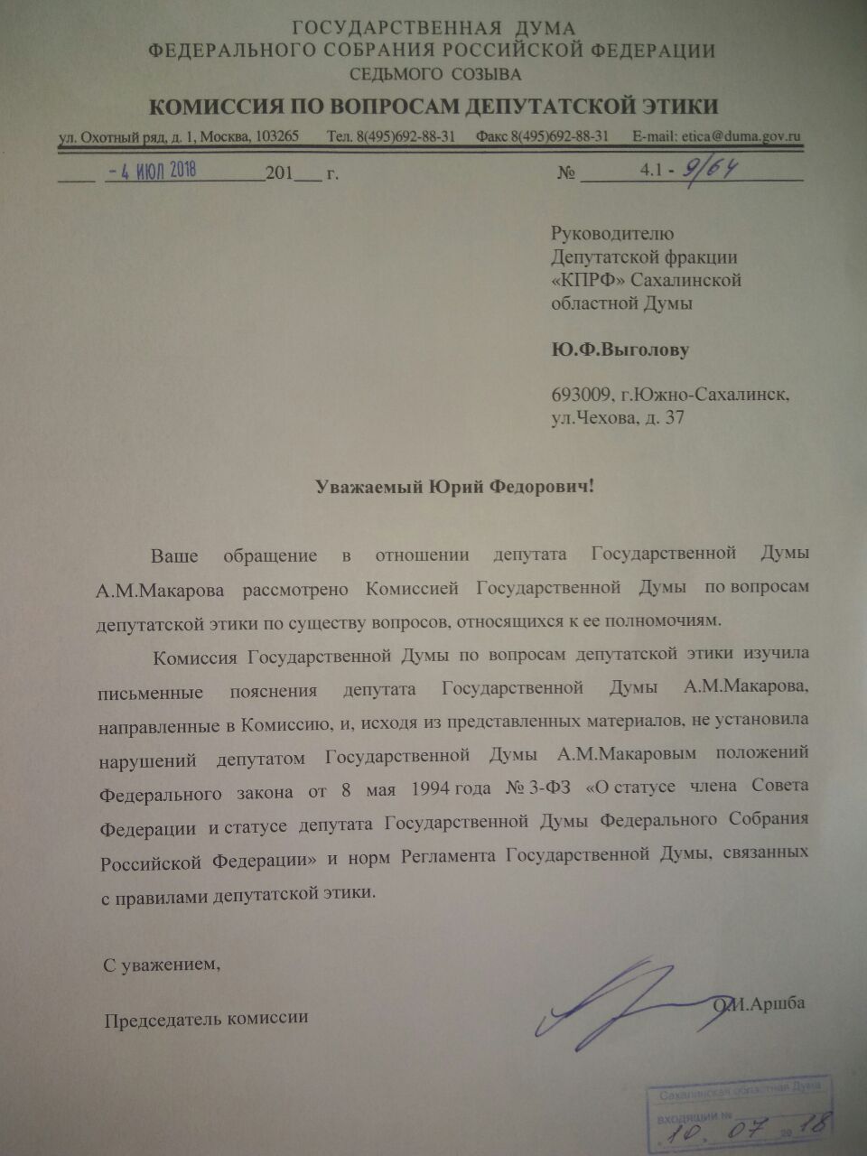 Государственная Дума РФ и Комиссия по депутатской этике так и не смогли признать «оплошность» председателя бюджетного комитета Андрея Макарова, который еще в 2017 году заявил главе нижней палаты Вячеславу Володину: «Согласие губернатора и Сахалинской областной Думы получено…», фактически не имея указанного документа от регионального парламента. Это его выступление прозвучало во время обсуждения изменений в Налоговый и Бюджетный кодексы РФ, в результате чего регион лишился налоговых поступлений от шельфового проекта на сумму более 30 млрд рублей в 2018 году. Теперь, в распоряжении сахалинских коммунистов, оказался уже финальный ответ Государственной Думы, который поставил точку в этом вопросе.