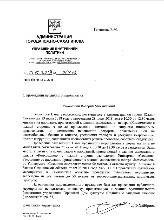 Южно-Сахалинское местное отделение КПРФ, в соответствии с существующим законодательством, заблаговременно подает в администрацию города Южно-Сахалинска уведомление о проведении 28 июля 2018 года митинга на площадке перед молодежным центром “Комсомолец”. Ответ чиновников звучит недвусмысленно – “отказать”.