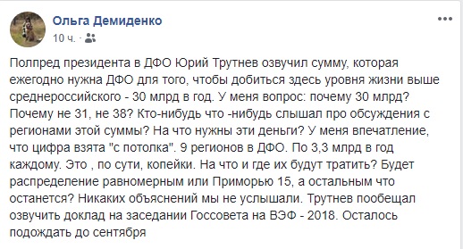 Полпред президента в ДФО Юрий Трутнев озвучил сумму, которая ежегодно нужна ДФО для того, чтобы добиться здесь уровня жизни выше среднероссийского – 30 млрд в год. У меня вопрос: почему 30 млрд? Почему не 31, не 38? Кто-нибудь что -нибудь слышал про обсуждения с регионами этой суммы? На что нужны эти деньги? У меня впечатление, что цифра взята “с потолка”. 9 регионов в ДФО. По 3,3 млрд в год каждому. Это , по сути, копейки. На что и где их будут тратить? Будет распределение равномерным или Приморью 15, а остальным что останется? Никаких объяснений мы не услышали. Трутнев пообещал озвучить доклад на заседании Госсовета на ВЭФ – 2018. Осталось подождать до сентября.