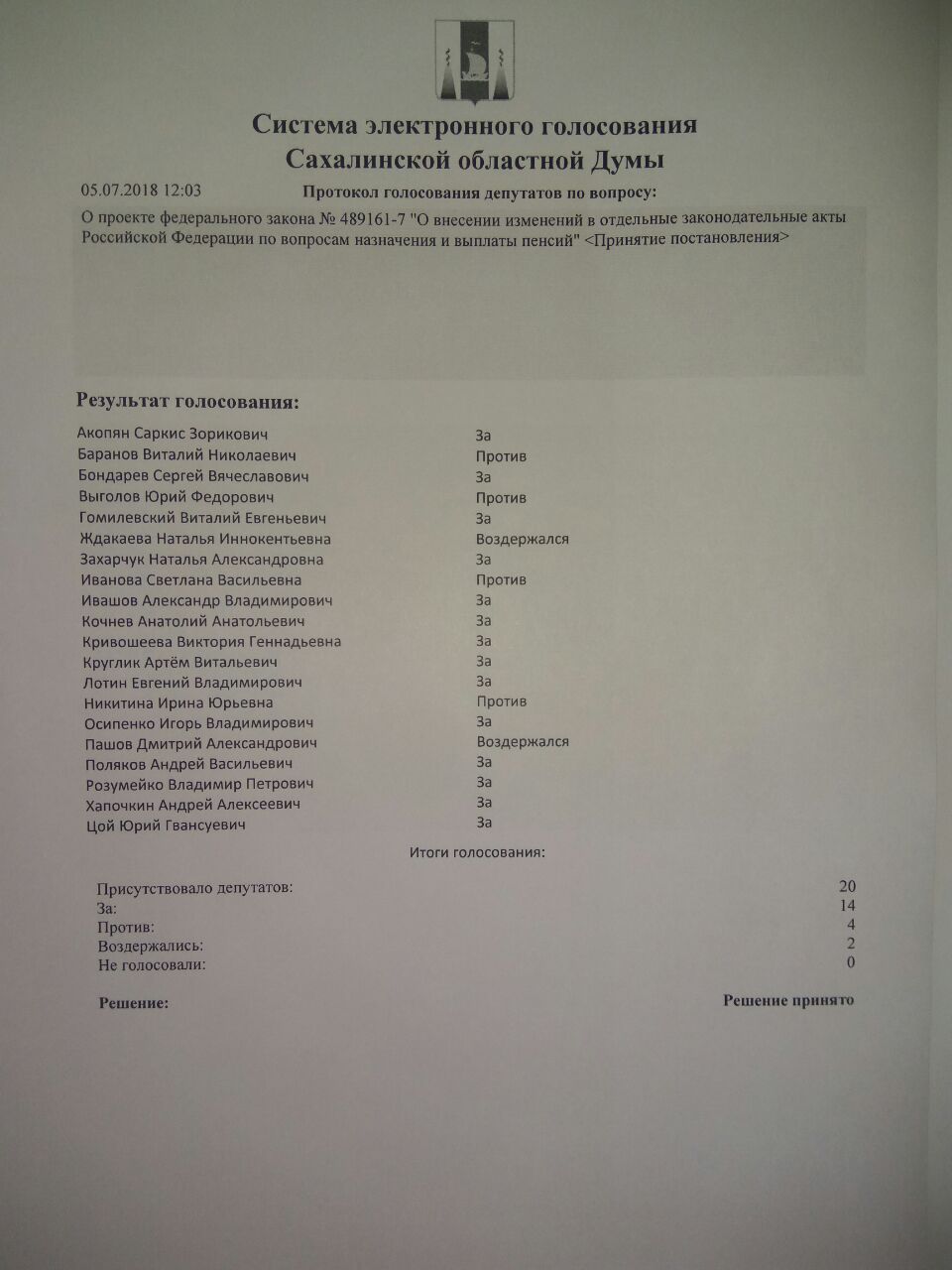 Поздним вечером, по сахалинскому времени, жители Сахалинской области с надеждой следили за ходом голосования в стенах Государственной Думы, на котором рассматривался в первом чтении законопроект об увеличении возраста выхода на пенсию. Буквально в первые минуты после процедуры голосования были получены его результаты: 328 депутатов проголосовало ЗА, 104 депутата – ПРОТИВ, ВОЗДЕРЖАЛОСЬ – 0. Депутаты-коммунисты единодушно голосовали ПРОТИВ.