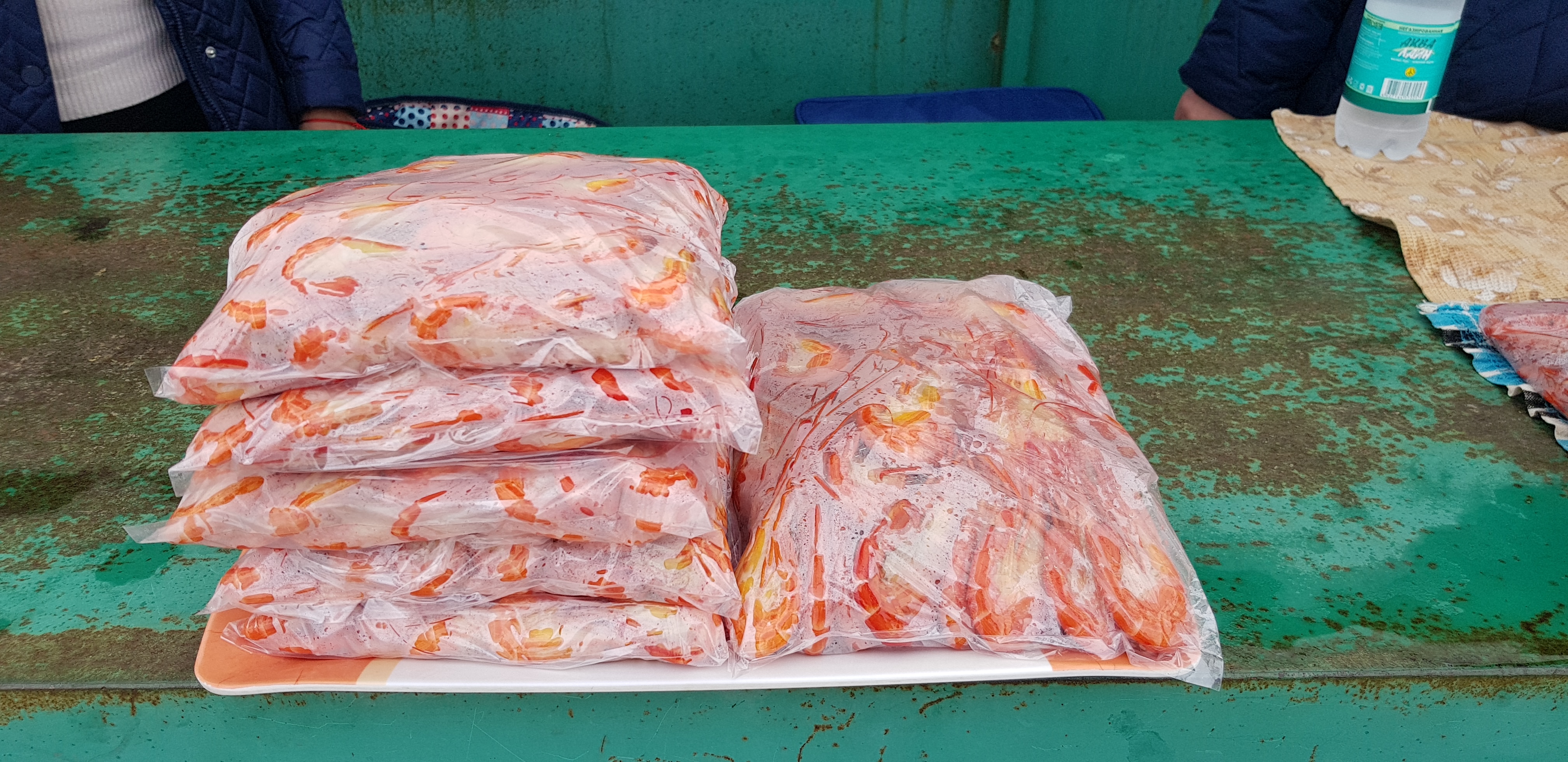 Название редкое, не знакомое жителям материковой части нашей страны. Удивляемся ценам. Пакет с “большой” креветкой стоит тысячу рублей, с маленькой – цена в два раза ниже. Стоит напомнить, в магазинах этот товар стоит несколько дешевле. Возможно, местные торговцы решили, что их продукция свежее и цена оправдана.