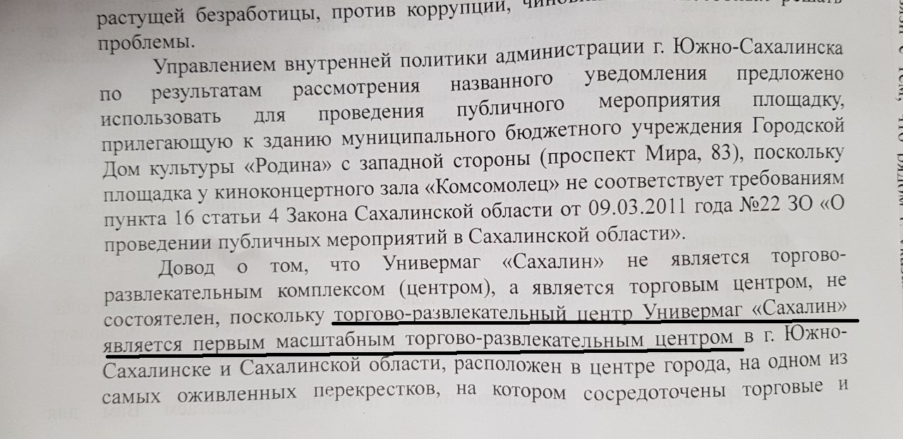 Нас постигло глубокое чувство разочарования. Мы опечалены сообщениями исполняющего обязанности мэра Южно-Сахалинска, которые та излагает в письменном виде. Сложилось впечатление, Наталья Куприна либо не понимает всю глубину определения “торгово-развлекательный”, либо она ищет любые предлоги для того чтобы запретить гражданам областного центра высказать свое отношение к проводимым пенсионным реформам. Тем временем граждане продолжают обсуждать грядущий митинг.
