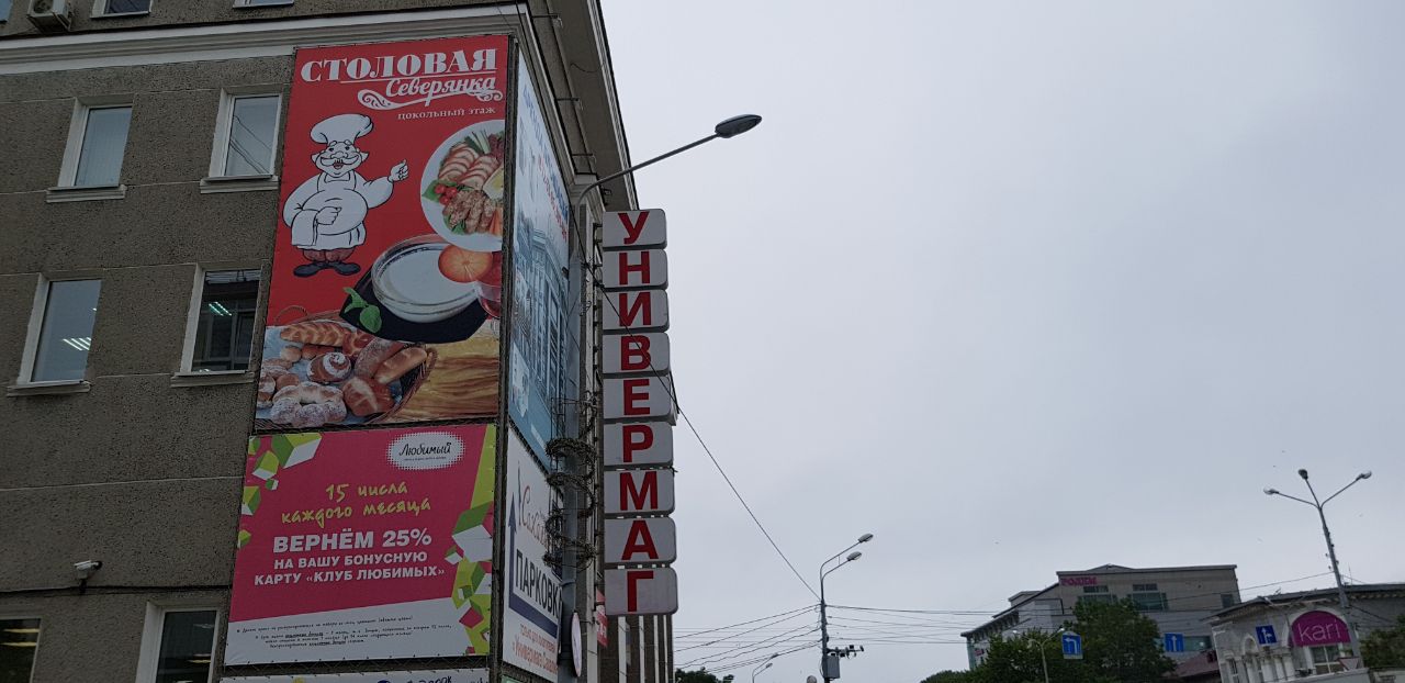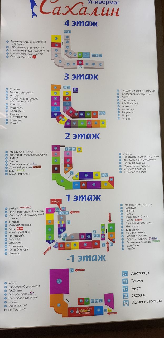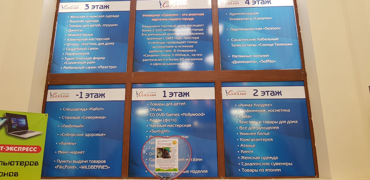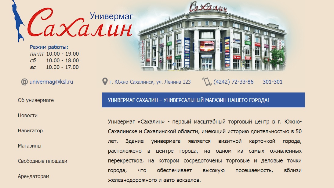 Сам “Универмаг Сахалин заявляет о себе достаточно просто – первый масштабный торговый центр в г. Южно-Сахалинске и Сахалинской области. Просто – торговый.