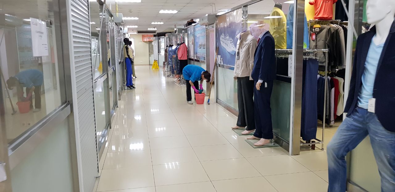В утренние часы посетителей мало, уборка в коридорах идет полным ходом.