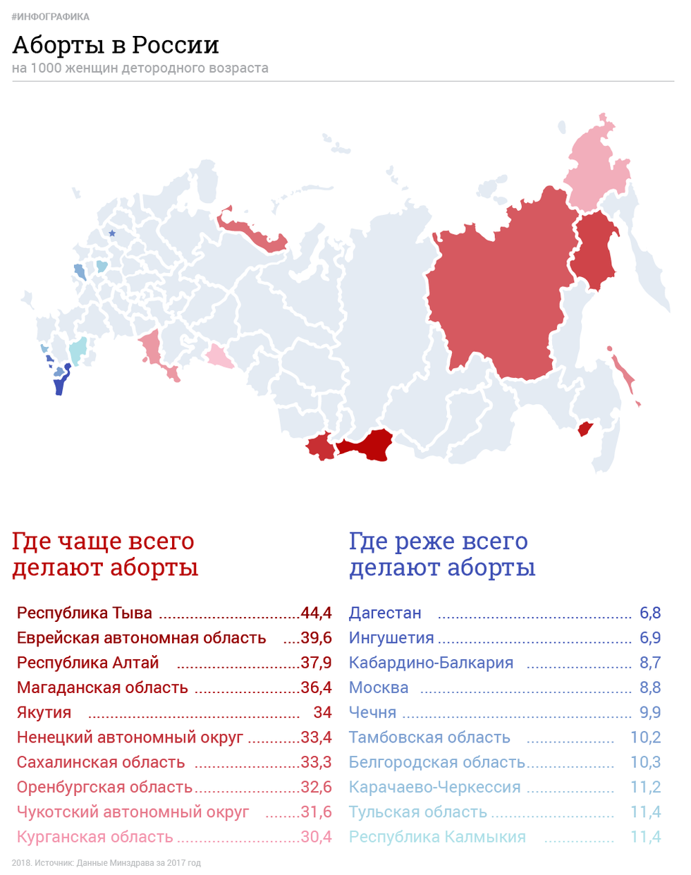 В списке регионов где чаще всего делают аборты, островной регион оказался на седьмом месте среди 85 российских субъектов. Еще три региона ДВФО (Еврейская АО, Магаданская область и Республика САХА (Якутия) сумели обогнать Сахалинскую область и занимают (соответственно) второе, четвертое и пятое место печального рейтинга. Похоже, наличие детей в дальневосточных семьях становится причиной их бедности, что косвенно влияет на показатели количества абортов.