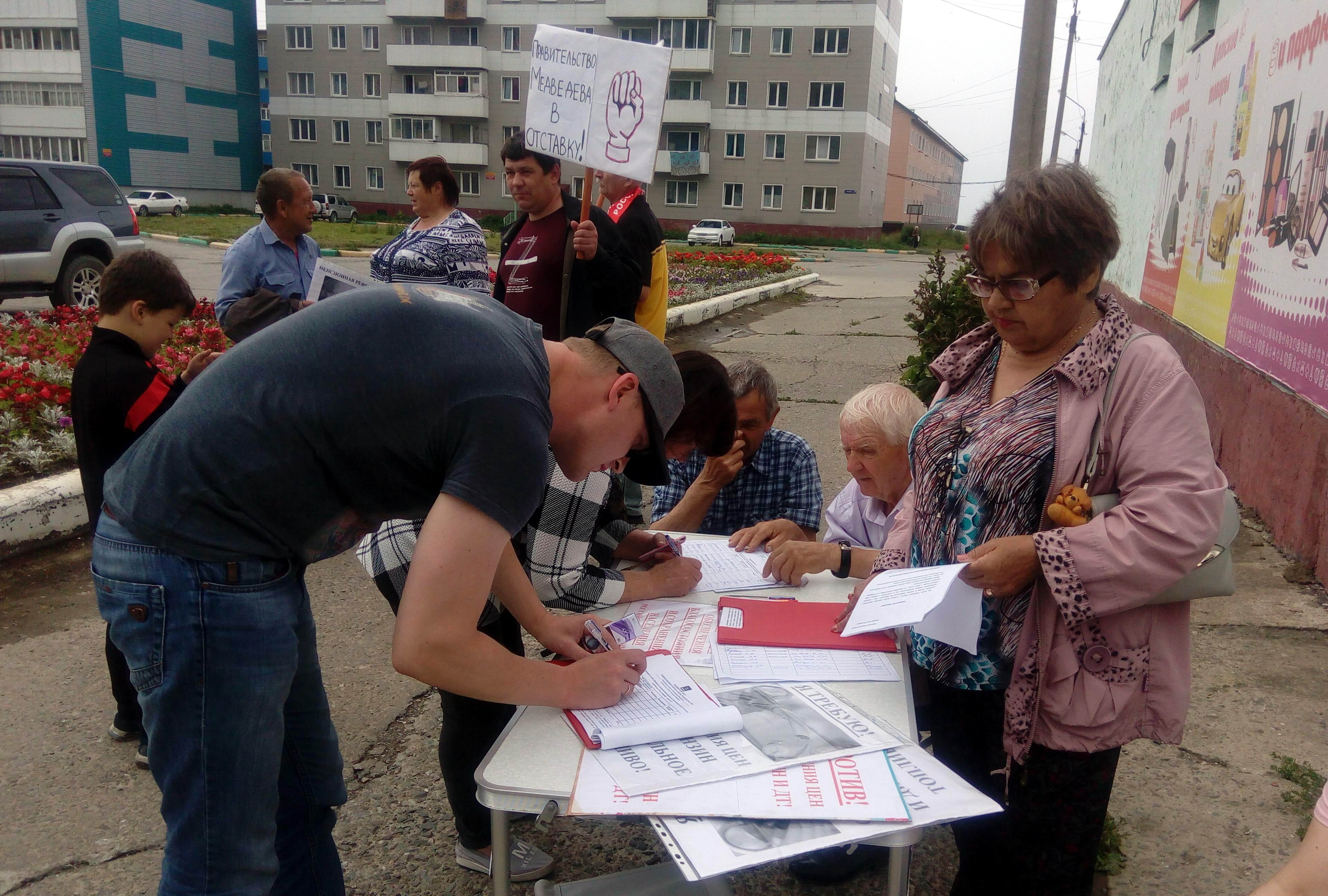 Здесь, поселке Шахтерск, жители смогли оставить свои подписи и заявить несогласие с предложением увеличить возраст выхода на пенсию. Островитяне считают – очередная реформа это скрытая форма грабежа граждан нашей страны.