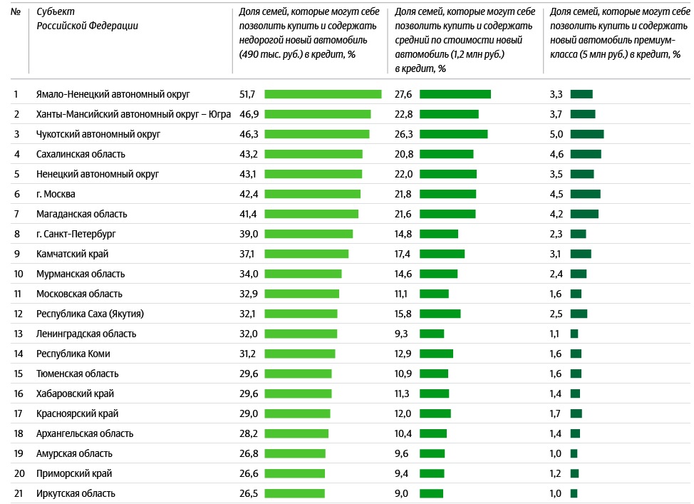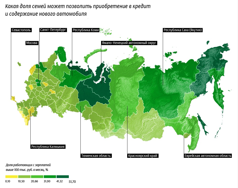 РИА-Рейтинг, по итогам 2017 года, предоставило на всеобщее обозрение данные, демонстрирующие практическую возможность россиян приобрести автомобиль в кредит. Эти данные основываются на показателе “средняя заработная плата” и учитывают количество работающих, которые ежемесячно получают в кассе своего предприятия более 100 тысяч рублей. По мнению экспертов, в Сахалинской области таких людей от 30% до 40%.