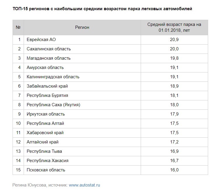 Исследования аналитического агентства “Автостат” косвенно подводят итог 2017 года и демонстрируют структурный и возрастной состав частного автопарка, который находится на руках автовладельцев. Приведенные цифры говорят о том, что жители Сахалинской области не спешат обновлять свои автомобили – их средний возраст составляет 20 лет. Регион прочно занимает второе место антирейтинга по стране. Самый молодой автопарк в России находится в республике Татарстан, там средний возраст техники составляет чуть более девяти лет.