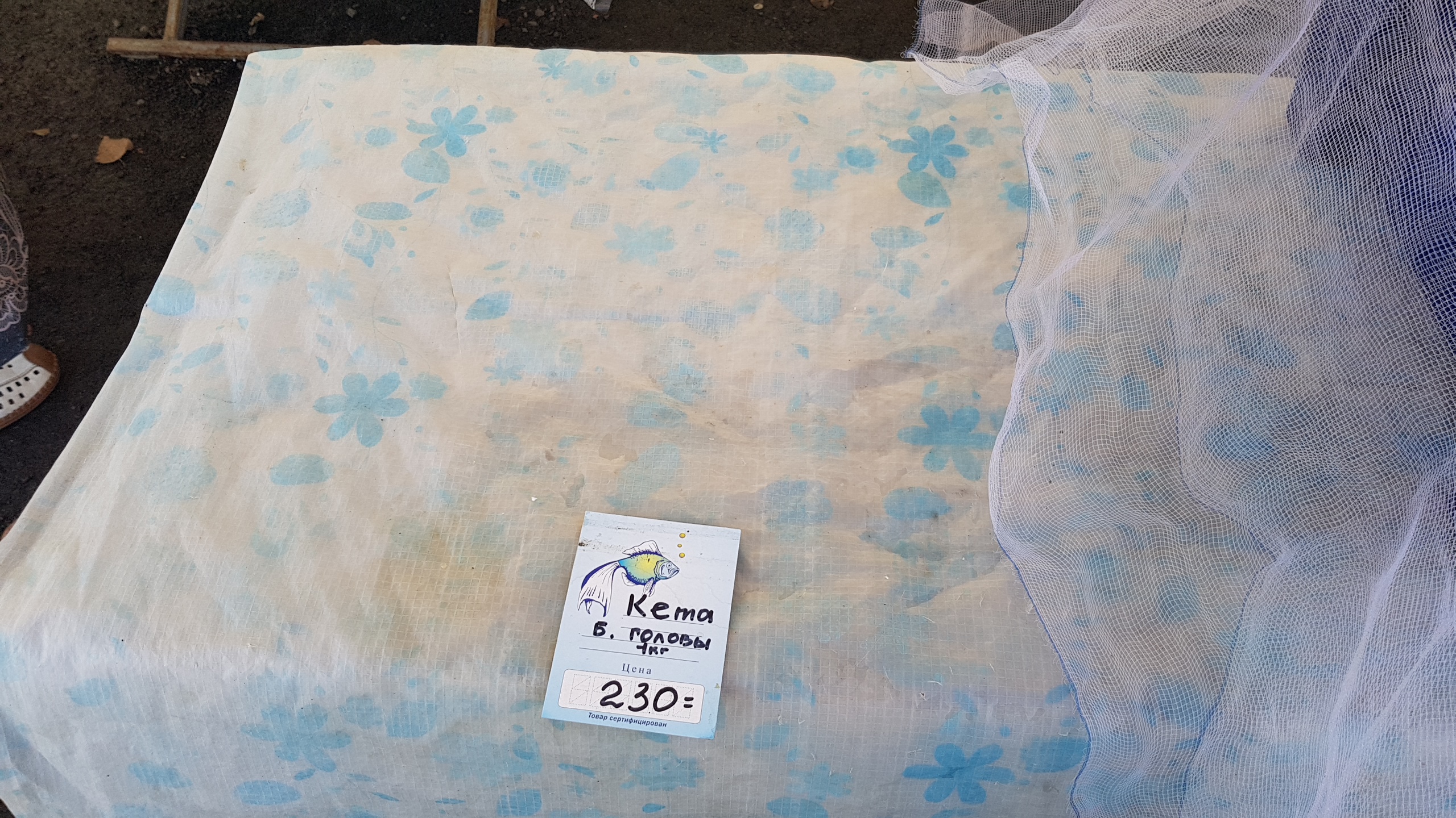 Горбуша бережно прикрыта сеточкой от мух и продается по 140 рублей, выражая протест против “социальной” цены местного правительства.